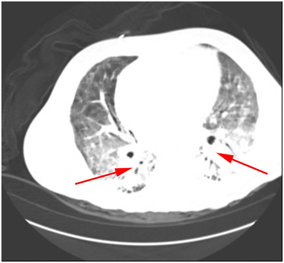 The following abnormal laboratory test results were obtained: red blood cell count, 3.14 × 1012 cells/L; hemoglobin, 109 g/L; lactate dehydrogenase, 1,723 U/L; plasma β-(1, 3)-D glucan, 600 pg/ml; procalcitonin, 2.71 ng/ml; C-reactive protein, 106.94 mg/L; erythrocyte sedimentation rate, 21 mm/h; Interleukin 6, 17.8 pg/ml; Interleukin 10, 7.57 pg/ml; KL-6, 2,153 U/ml; Coxsackie virus, EB virus, measles virus, and cytomegalovirus IgG positive; percentage of total T lymphocytes, 48.77%; Absolute number of helper/inducible T lymphocytes, 32/μl; Candida albicans and Pseudomonas aeruginosa were detected by traditional microbiological testing. Chest CT showed multiple patchy and flocculent high-density shadows in both lungs (Figure 3). BALF was collected for examination on the second day of admission, and P. jirovecii was detected only upon mNGS. No P. jirovecii was found upon GMS. The results of mNGS detection in BALF showed that sequence number of P. jirovecii was 1,319 (Table 2). Subsequently, on the fourth day of admission, we collected lung tissue through fiberoptic bronchoscope for the same test. GMS (Figure 2B) and mNGS all detected P. jirovecii, but the detection period of mNGS was 1 day shorter than that of GMS. mNGS in lung tissue smear showed that sequence number of P. jirovecii was 297 (Table 2). Based on the GMS and mNGS results, the patient was diagnosed with PJP. SMZ-TMP had been empirically applied on the second day of admission. Originally, we gave patients biapenem, voriconazole, gamma globulin, and other symptomatic treatments. However, the progress of this patient was the same as that of the patient 1. Even after we gave mechanical ventilation, extracorporeal membrane oxygenation (ECMO), vasoactive drugs, and other rescue treatments, the patient's condition did not improve. Ultimately, she gave up treatment and was automatically discharged on the eleventh day of admission. She eventually died on the seventh day after her discharge from the RICU.