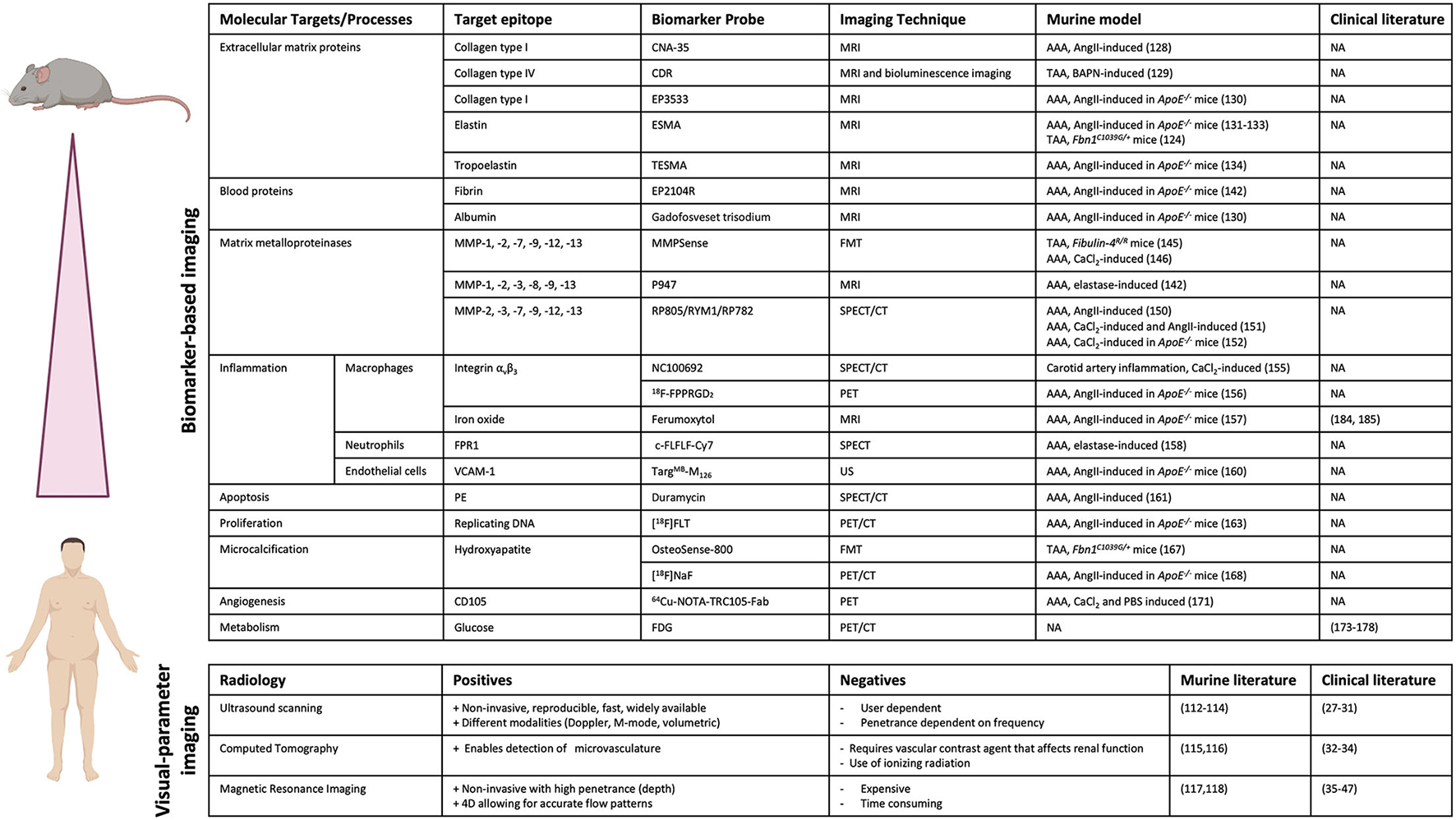 Currently, novel imaging techniques are being explored that apply molecular targeting of specific underlying pathways involved in AA formation and progression. Several of the previously mentioned mouse models have been used in pre-clinical trials to test these novel imaging techniques. Molecular targets that are under investigation for imaging applications with respect to AA formation include ECM proteins, MMPs, immune cells and SMC phenotype (Figure 4).
