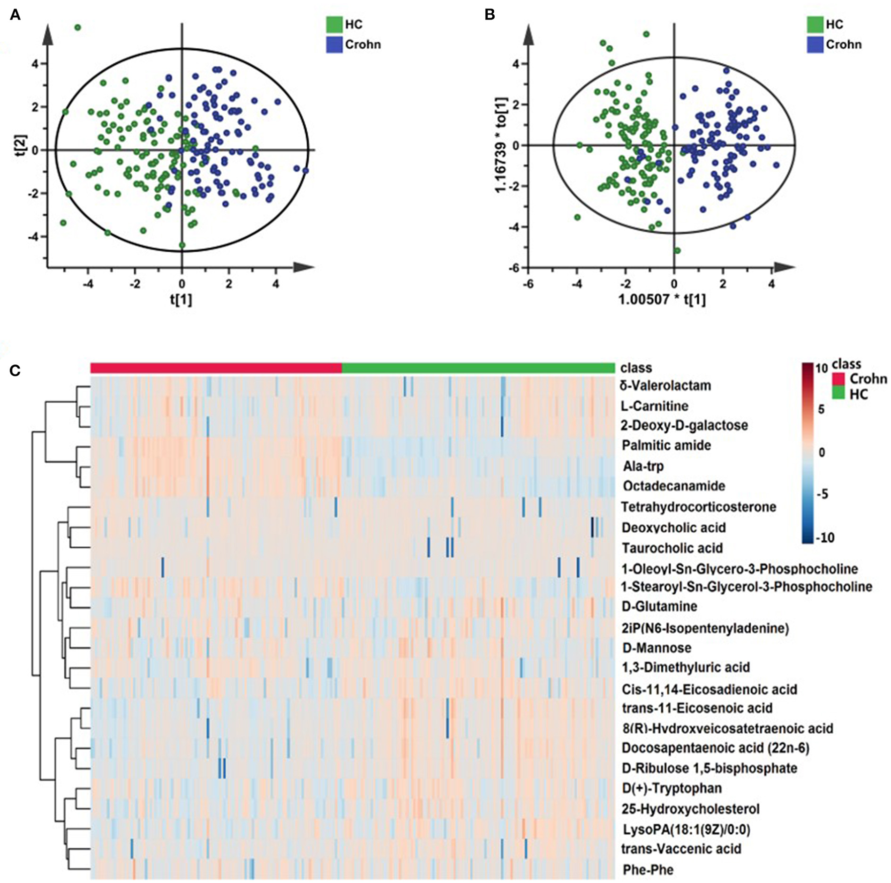 The whole workflow of this study is shown in Figure 1. A total of 1,690 features in positive mode and 1,021 features in negative mode were detected using UPLC-TOF-MS. After data processing, we conducted multivariate statistical analysis using SIMCA. The PCA could outline the original distribution of metabolites, but the scatter plot failed to show a clear distribution in both modes. As show in Figures 2A,B, the OPLS-DA scatter plot could be divided into two clusters, which indicated the differentiation between the groups. The models presented satisfactory fit (R2 = 0.917, Q2 = 0.741 in positive ion mode; R2 = 0.856, Q2 = 0.743 in negative ion mode). Furthermore, the 200-permutation test indicated all Q2 and R2 values to the left were lower than the original points to the right which results validated the OPLS-DA models (Figures 2C,D). Combined with univariate Wilcoxon rank-sum test (adjusted P < 0.05), we screened 25 differential metabolites (Supplementary Table S1). In addition, the 25 differential metabolites were subjected to PCA, OPLS-DA and cluster analysis. As show in Figure 3, both in the PCA, OPLS-DA, the samples were clearly separated between the two groups. Heatmap shows that these 25 metabolites are significantly different. Therefore, the 25 differential metabolites could well-distinguish CD patients from HCs.