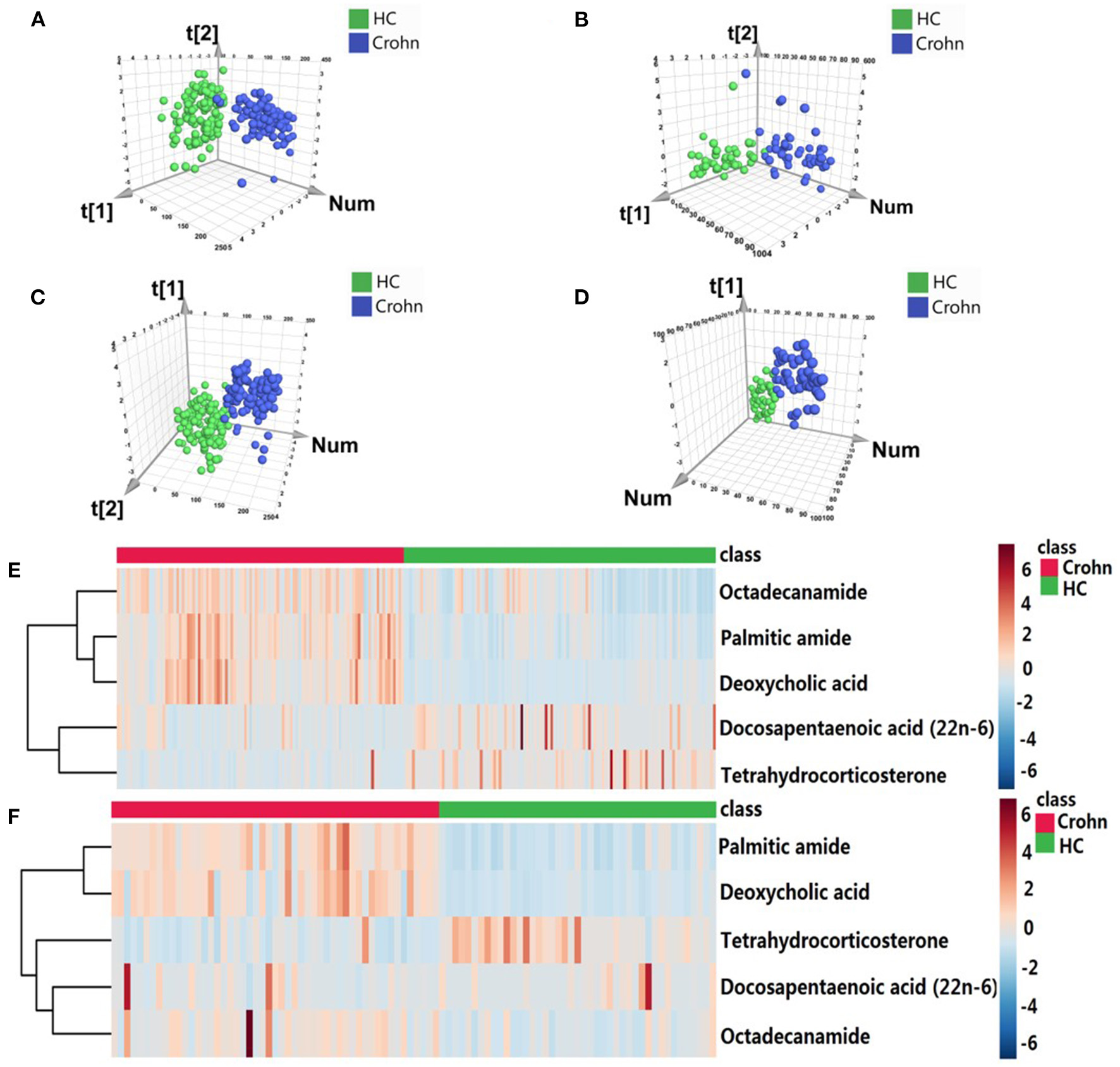 The performance of five overlapping metabolites for classification. The scatter plots of PCA based on five metabolites in the (A) discovery and (B) validation cohorts. The PLS-DA scatter plots of five metabolites in the (C) discovery and (D) validation cohorts. Heatmap of cluster analysis of each metabolite in the (E) discovery and (F) validation cohorts.