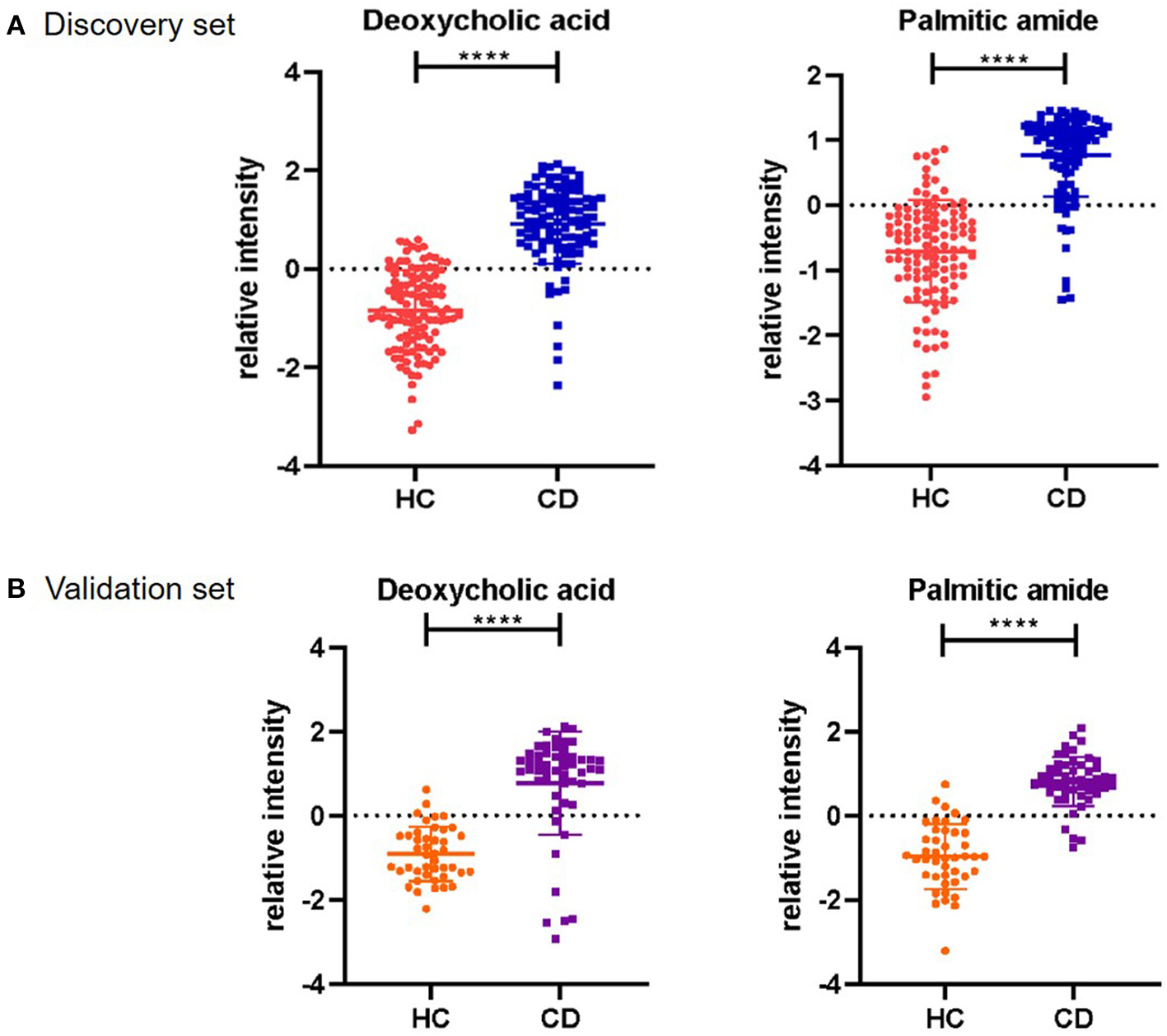 Serum relative intensity of the defined potential biomarkers. Discrimination of CD patients and healthy individuals with the combination of two potential biomarkers. Serum relative intensities of Deoxycholic acid and Palmitic amide in the discovery set (A) and validation set (B). Statistical differences are marked by an asterisk, ****P < 0.0001.