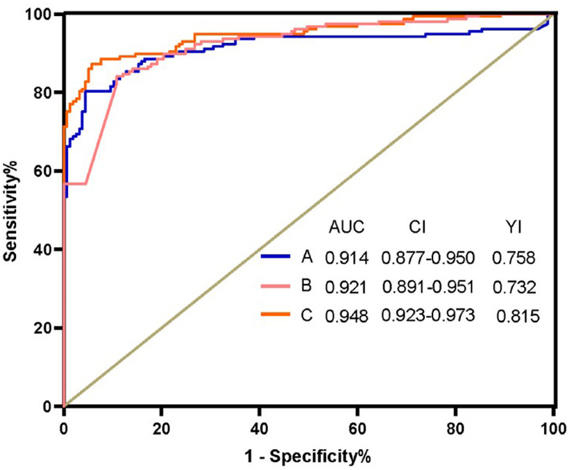 Receiver operating characteristic curve analysis (ROC) of Deoxycholic acid, Palmitic amide and their combination. (A) ROC of Deoxycholic acid (B) ROC of Palmitic amide. (C) ROC of the combination Deoxycholic acid, Palmitic amide. AUC, area under the curve; CI, confidence interval; YI, Youden index.