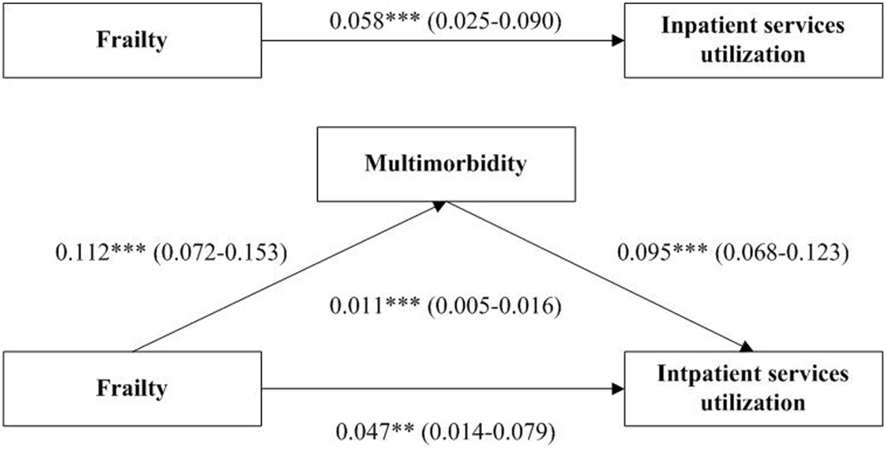 Table 2 presents the correlation matrix of the association among frailty, multimorbidity and inpatient services utilization. Frailty was positively associated with inpatient services utilization (ρ = 0.139, p < 0.001). Multimorbidity was positively associated with frailty (ρ= 0.168, p < 0.001) and also positively associated with inpatient services utilization (ρ= 0.190, p < 0.001).