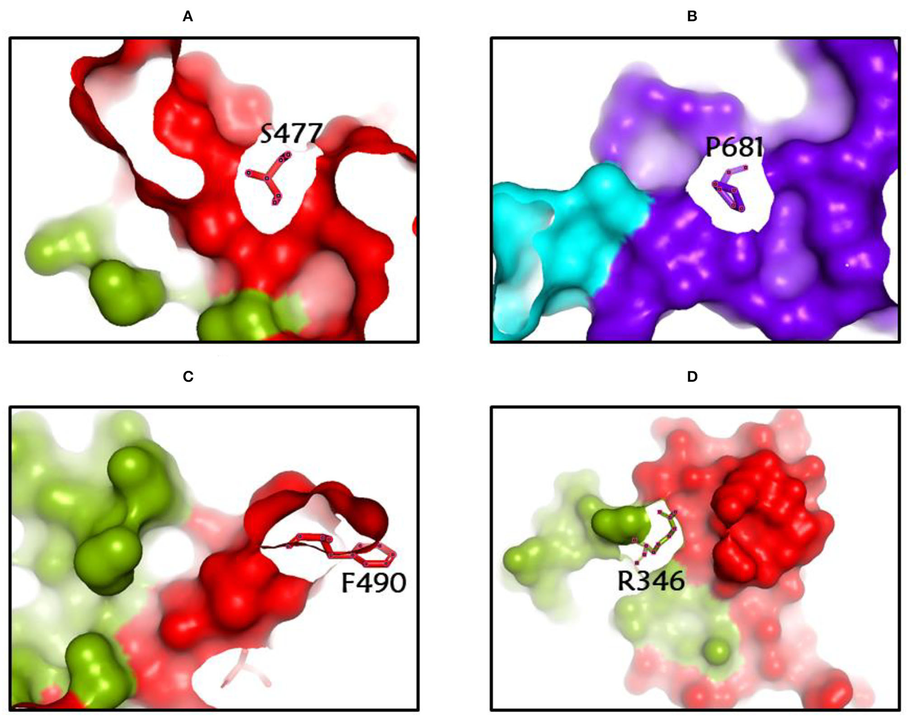 (A-D) The most common spike glycoprotein residues (S477, P681, F490, R346) where diverse mutations occur, resulting in different SARS-CoV-2 VOCs, VOIs, and VBMs.