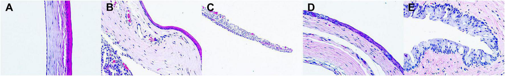 Representative images of H&E staining of ocular tissues on days 7. (A) the cornea; (B) the limbus; (C) the iris; (D) the bulbar conjunctiva; (E) the fornix conjunctiva (magnification: 40×).