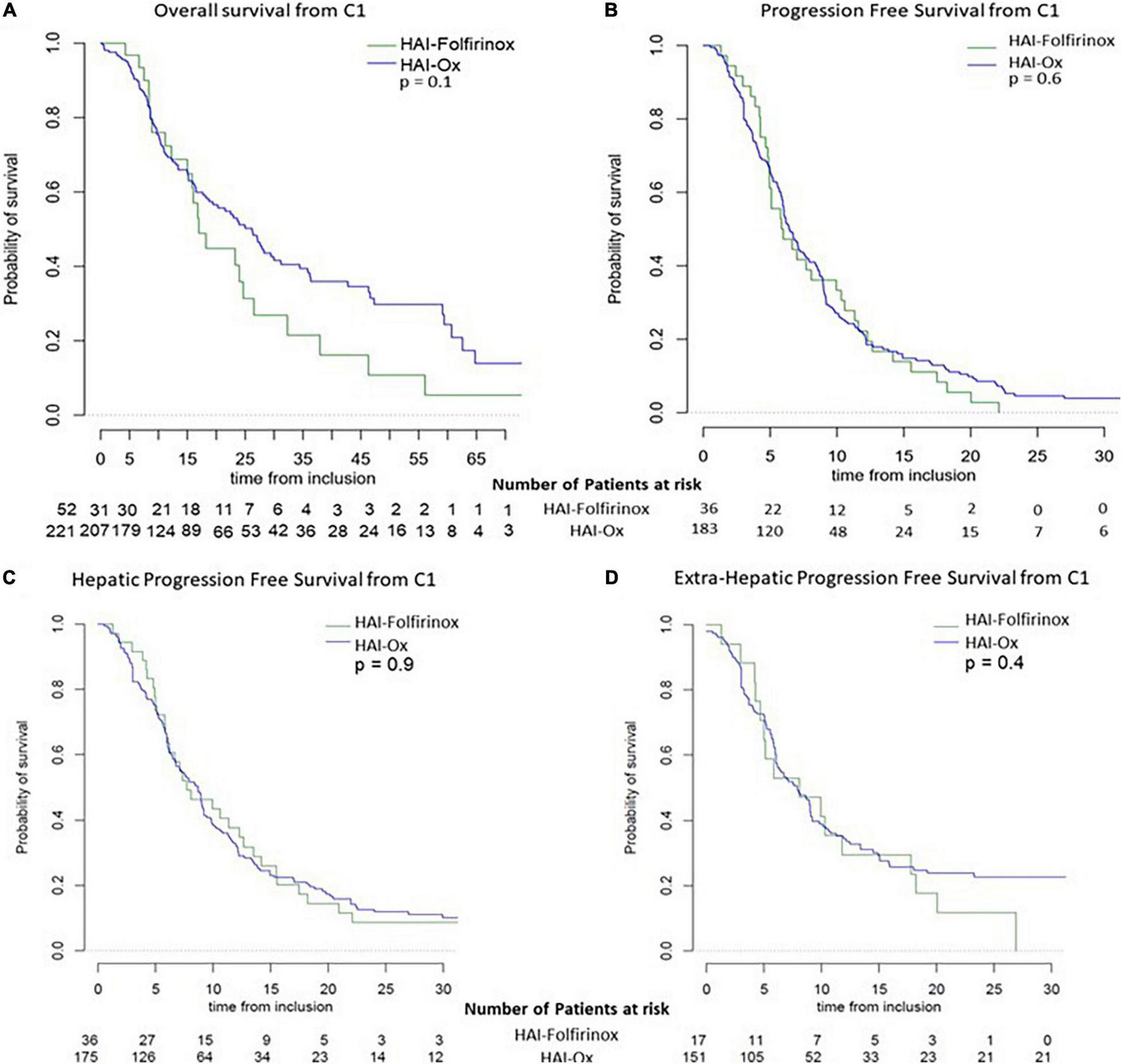 Progression-free survival (PFS) was defined as the time elapsed from the beginning of HAI treatment until progression (any site for global-PFS, hepatic for liver-PFS) or death (all causes). Overall survival (OS) was defined as the time elapsed from the beginning of HAI treatment until death (all causes).