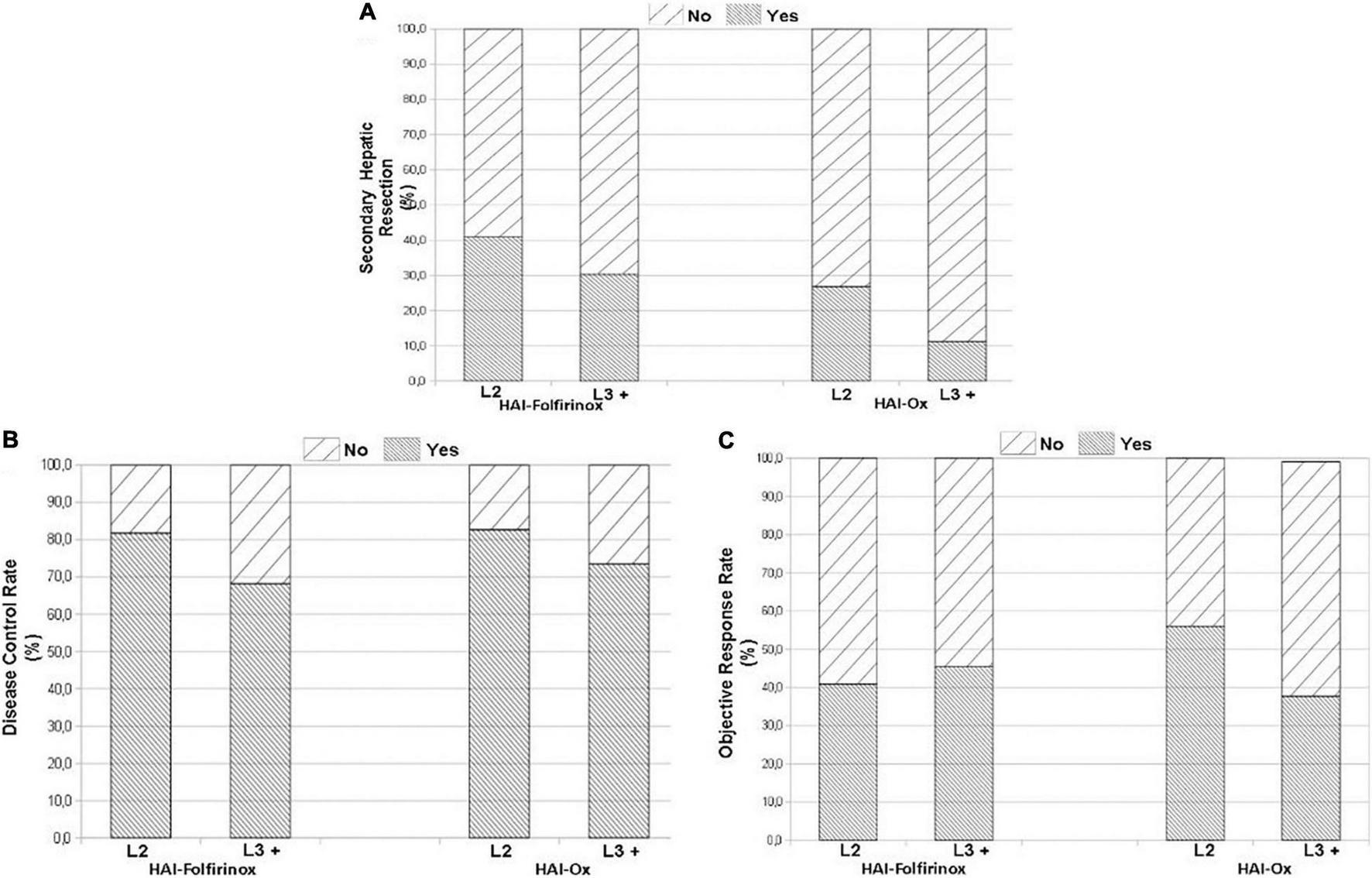 Concomitant IV cytotoxic chemotherapy was administered in 96.3% of patients in the HAI-Ox group and in no patients in the HAI-Folfirinox group. IV-targeted therapies were more frequently administered with HAI-Folfirinox (86.5%) than with HAI-Ox (37.3%), in particular for anti-epidermal growth factor receptor (EGFR; Table 2).