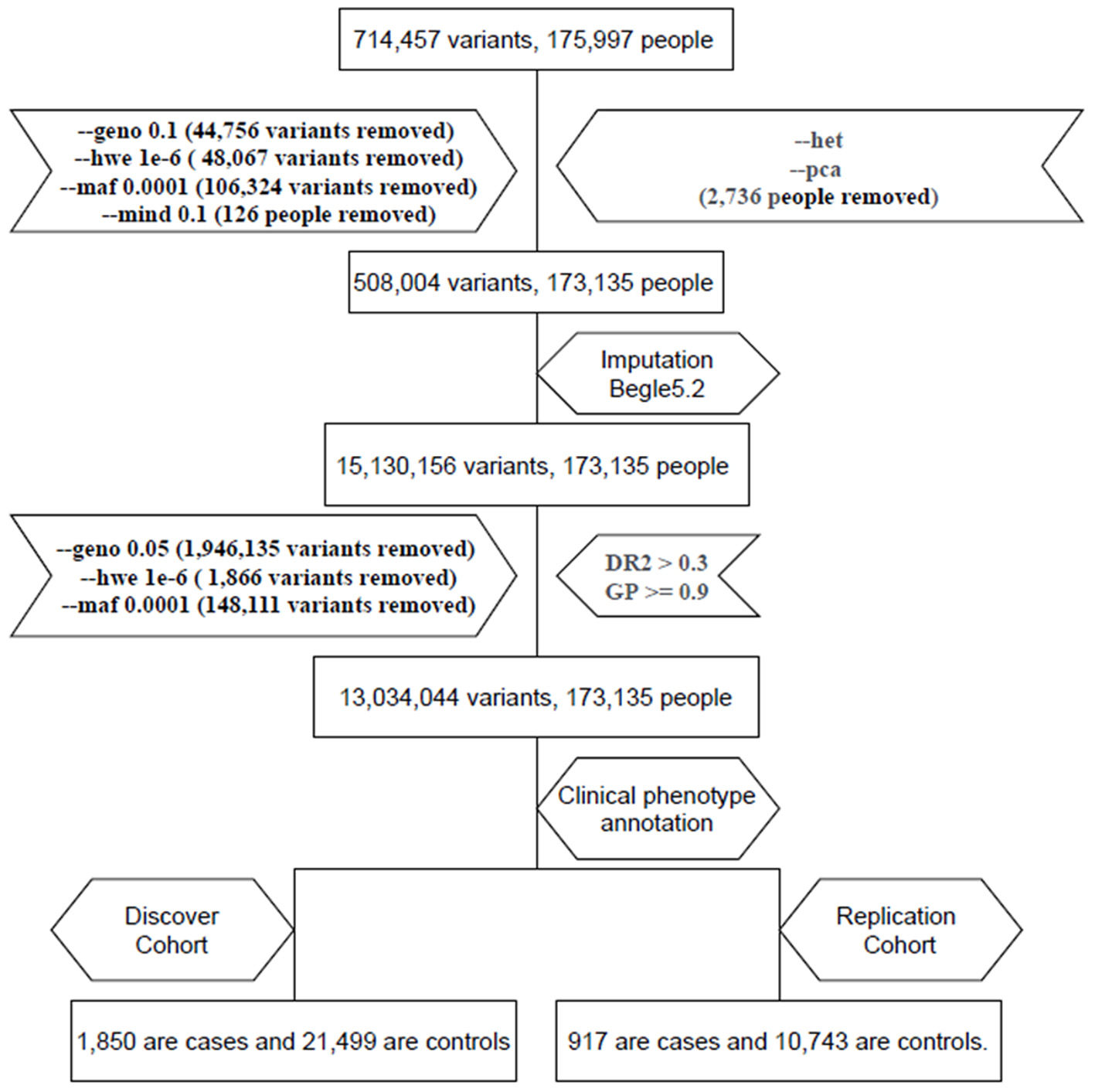 We used the TPMv1 customized SNP array (Thermo Fisher Scientific, Inc., Santa Clara, CA, USA), which was designed from the Academia Sinica and Taiwan Precision Medicine Initiative (TPMI) teams. The SNP array contained approximately 714,457 SNPs. PLINK1.9 (11) was used for the analysis. We excluded subjects and SNPs with missing rates (subjects excluded: missingness per marker –geno 0.1 > 10% for SNPs and missingness per individual –mind 0.1 >10% for subjects). We filtered out variants with a Hardy–Weinberg equilibrium p < 10−6 (–hwe 10−6) and minor allele frequency (MAF) of <10−4 (–maf 0.0001). Therefore, 508,004 variants and 173,135 subjects passed the filters and the quality control process; then, we used Beagle 5.2 to impute. The imputed data were filtered out using an alternate allele dose of <0.3 and a genotype posterior probability of <0.9 as the criteria (12). After the quality control and imputation process, we analyzed 13,034,044 variants and 173,135 subjects (13) (Figure 1).