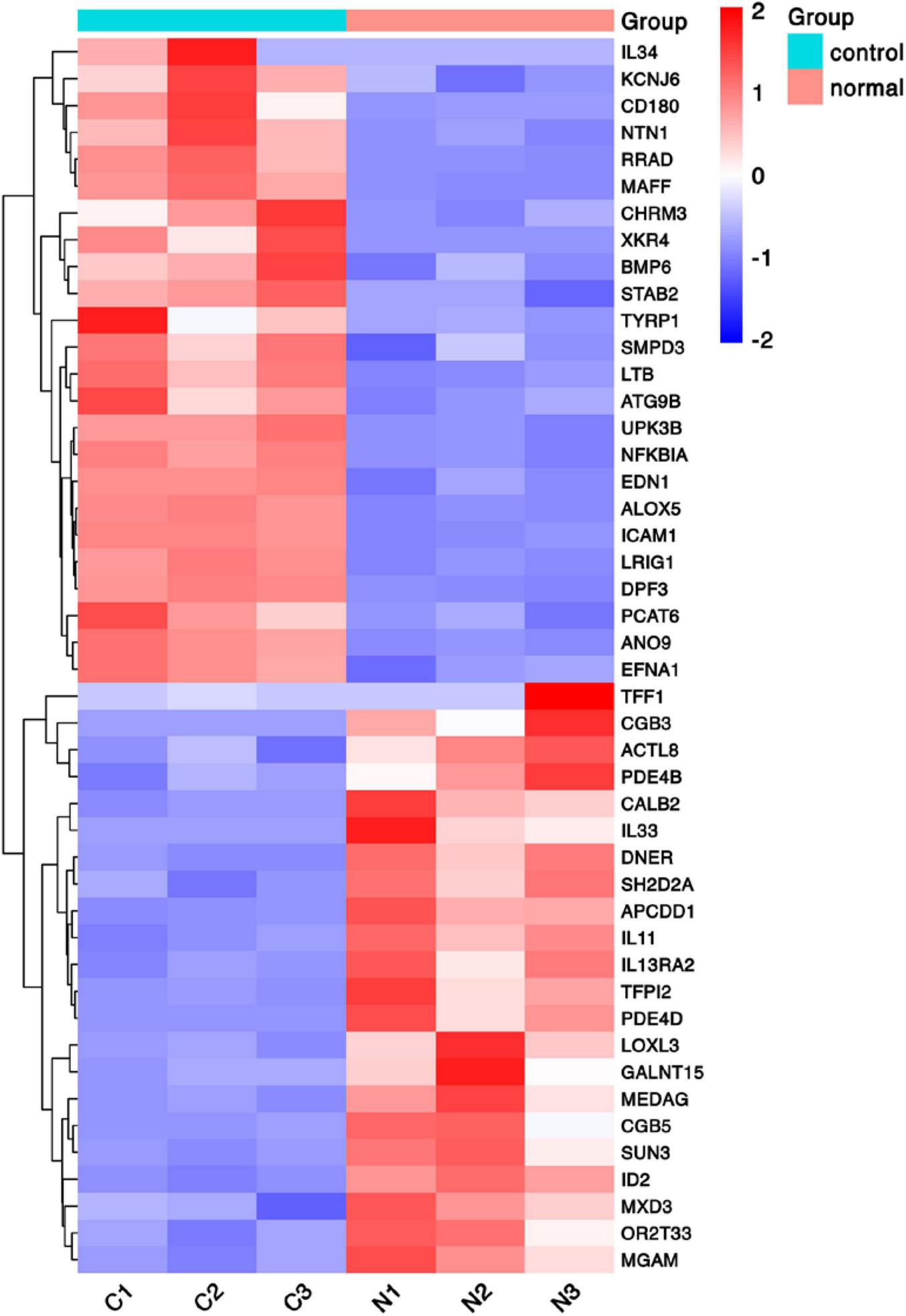 Heat map of hierarchical clustered genes. A heat map of hierarchical clustered genes. In total, there were 46 genes from the genomics data showing a significantly aberrant expression (at least two-fold change), p < 0.05. In the clustering analysis, red and blue regions indicate the up-regulated and down-regulated genes, respectively. C1, C2, C3, and N1, N2, N3 represent the three independent repetitions of the control group and the vitreous induction group, respectively.