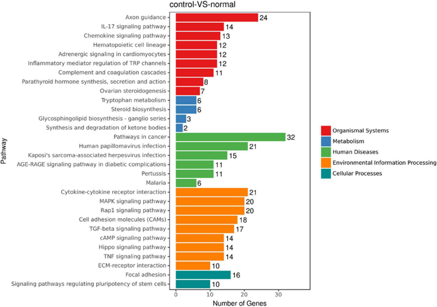 Notably, Gene Ontology (GO) and Kyoto Encyclopedia of Genes and Genomes (KEGG) are two databases, and enrichment analysis is an integrated calculation of the functional information in the database. The full name of GO database analysis is Gene Ontology, and it divides the function of genes into three parts: cellular component (CC), molecular function (MF), and biological process (BP). Using the GO database, we can get the disease correlation of the target gene at the three levels of CC, MF, and BP. KEGG database analysis is a kind of pathway-related database to study the various pathways of the human body that genes participate in (24, 25).