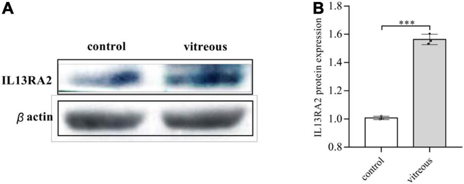 Vitreous induced the protein expression of IL13Rα2. Western blot analysis of the vitreous-induced protein expression of IL13RA2 in ARPE-19 cells. One of three representative experiments is shown. Bar graphs showed the Western blot band intensity, and the mean ± SD of three independent experiments is shown; *** denotes 0.001, using paired t test. (A) The protein expression of IL13RA2 in ARPE-19 cells. (B) Histogram of protein expression gray value. The mean ± SD of three independent experiments is shown; *** denotes 0.001, using paired t test. Control: ARPE-19 cells treated with DMEM/F12 only. Vitreous: ARPE-19 cells treated with vitreous diluted in DMEM/F12.