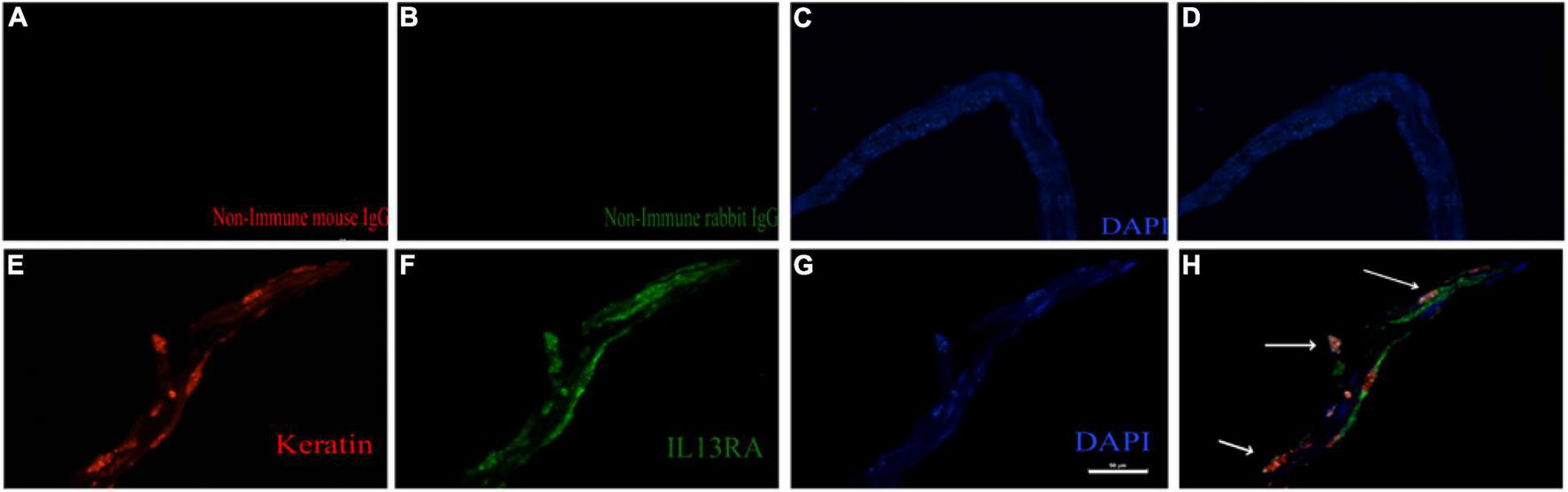 We next investigated whether IL13Rα2 was expressed in RPE cells within the epiretinal membranes from PVR patients. To this end, we stained epiretinal membranes with antibodies against keratin specific for epithelial cells and IL13Rα2. The immunofluorescence results showed that IL13Rα2 was highly expressed in RPE cells in epiretinal membranes from PVR patients (Figure 6).