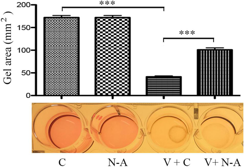 Blocking IL13Rα2 prevents vitreous-induced contraction of RPE cells. After the mixtures of ARPE-19 cells with collagen I solution formed a collagen gel, they were treated with DMEM/F12 + an antibody or vitreous + an antibody for 48 h. C, control antibody; N-A: neutralizing antibody against IL13Rα2; V + C, vitreous + control antibody; V + N-A, vitreous + neutralizing antibody against IL13Rα2. *** denotes 0.001, using paired t test.