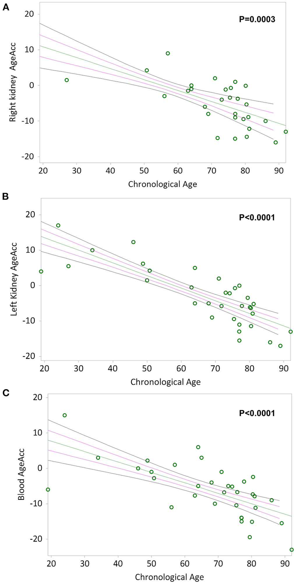 AgeAcc of the right kidney, the left kidney, and blood leukocytes correlation with donors' chronological age. In (A) and (B), non-parametric linear regression plots showing the correlation between AgeAcc of RK and LK, and donors chronological age (Kendall's rank correlation coefficient tau b for RK = −0.483 and tau b for LK = −0.638). In (C), non-parametric linear regression plot showing the correlation between AgeAcc of the circulating blood leukocytes (indicated as “blood AgeAcc”) and the donors chronological age (Kendall's rank correlation coefficient tau b = −0.526). Mean, Standard Error (SE) and 95% coefficient intervals (CI) are represented as green, pink and black lines, respectively.