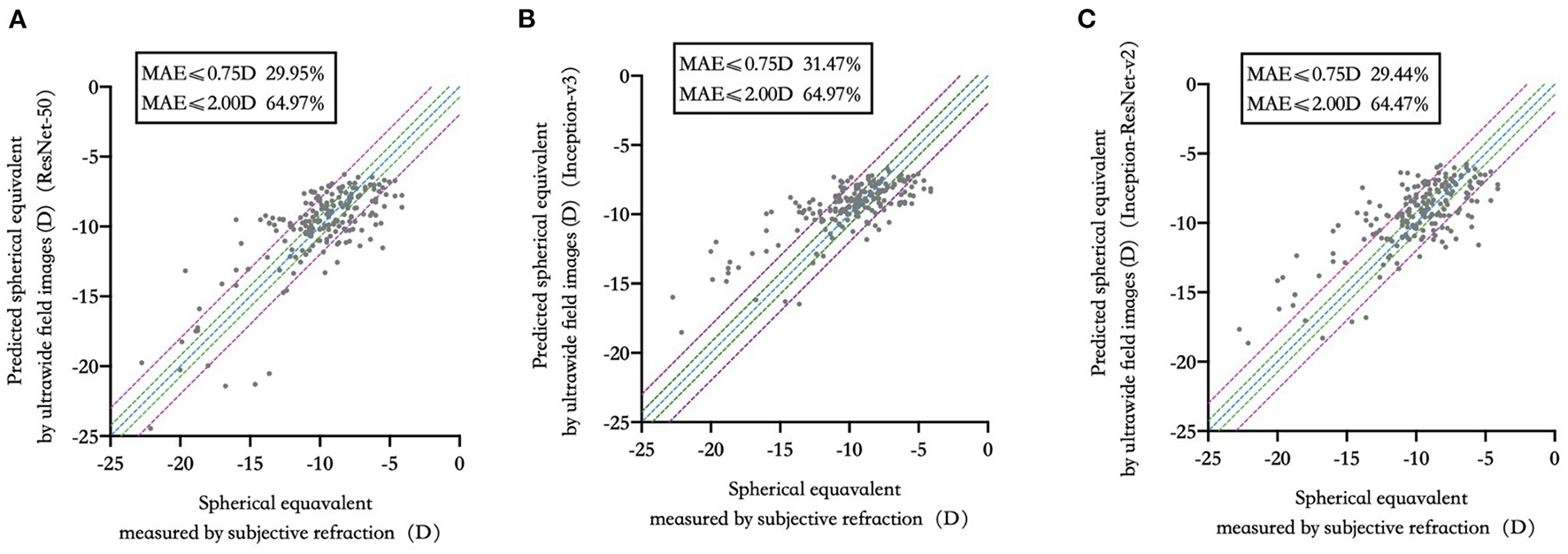 Predicted spherical equivalent versus that measured by subjective refraction in three deep learning models. (A) ResNet-50; (B) Inception-v3; (C) Inception-ResNet-v2.