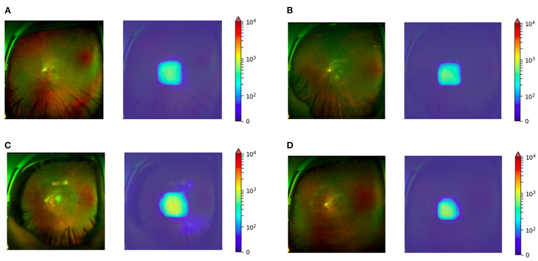 The MAE was related to the older age (P < 0.01) and the greater spherical power (P < 0.01). Univariate and multivariate analyses of parameters associated with MAE were detailed in Table 1. Examples of typical UWF images in the test set with MAE ≤ 0.5D were shown in Figures 4A–D. The macular and optic papilla area of UWF images made a significant contribution to refractive error prediction in the weighted heat map.