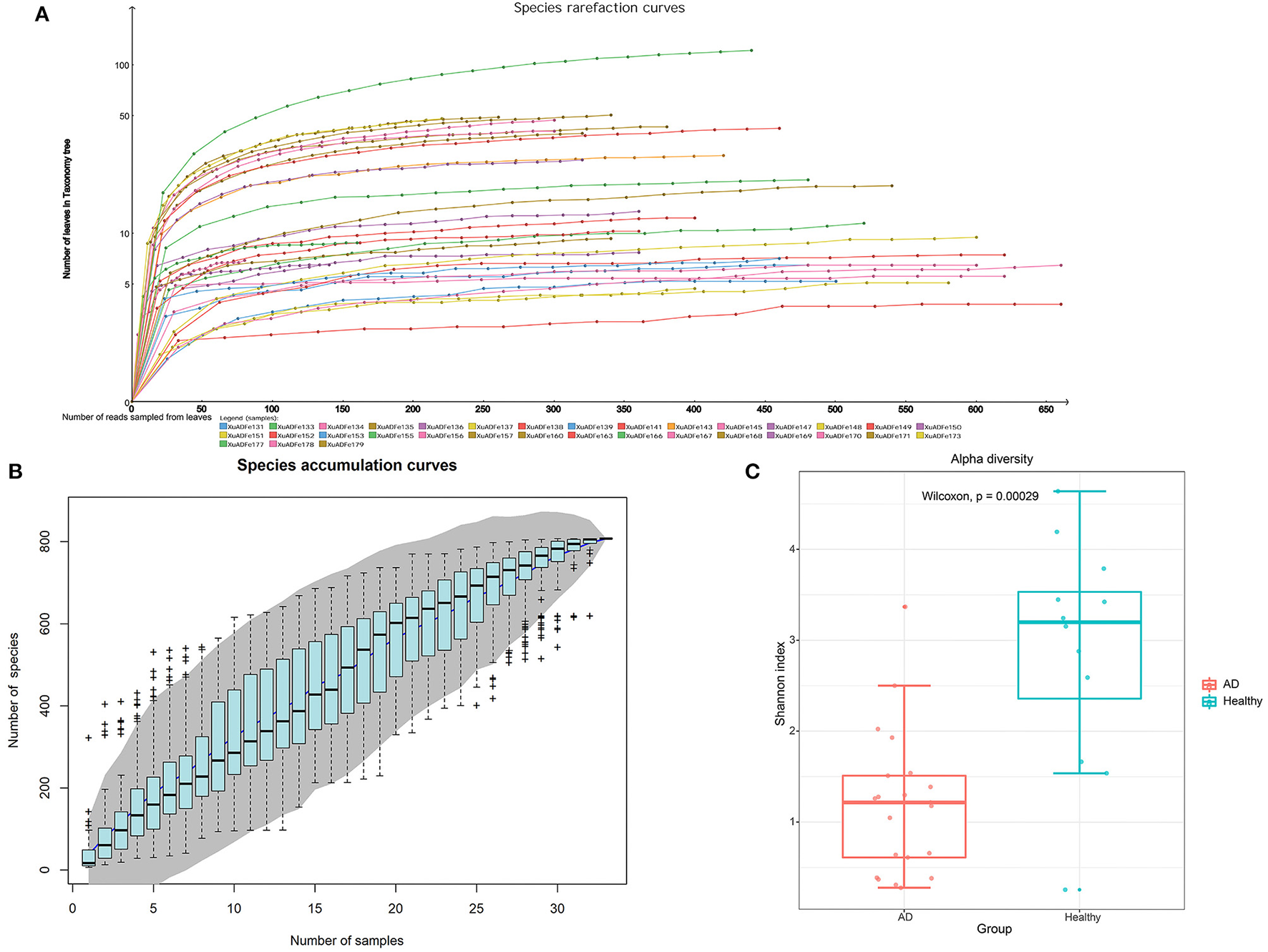 The richness and alpha diversity of viral species. (A) Species rarefaction curve drawn by Megan6 software after log scale transformation. Legends are displayed at the bottom of the figure, and each legend represents a library whose color corresponds to the color of the curve. (B) Based on the species accumulation curve of individual pool, the abscissa represents the number of sampled libraries, and the ordinate represents the cumulative number of species found. The gray shading indicates the 95% confidence interval. (C) Comparison of virus alpha diversity (Shannon index) between the AD patients group and the healthy controls group. The horizontal bars within boxes represent medians. The tops and bottoms of boxes represent the 75th and 25th percentiles, respectively. The upper and lower whiskers extend to data no more than 1.5× the interquartile range from the upper edge and lower edge of the box, respectively. The numbers of samples in this figure are as follows: AD patients (n = 21), healthy controls (n = 12).