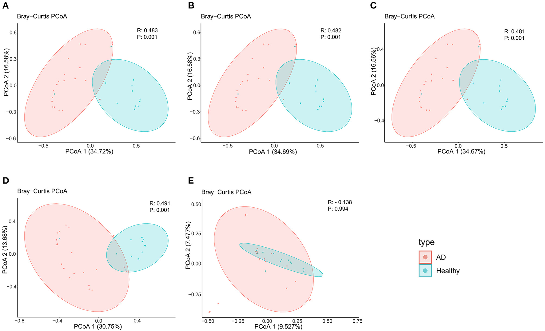 PCoA analysis of AD patients and healthy controls group at the (A) phylum, (B) class, (C) order, (D) family, and (E) genus levels.