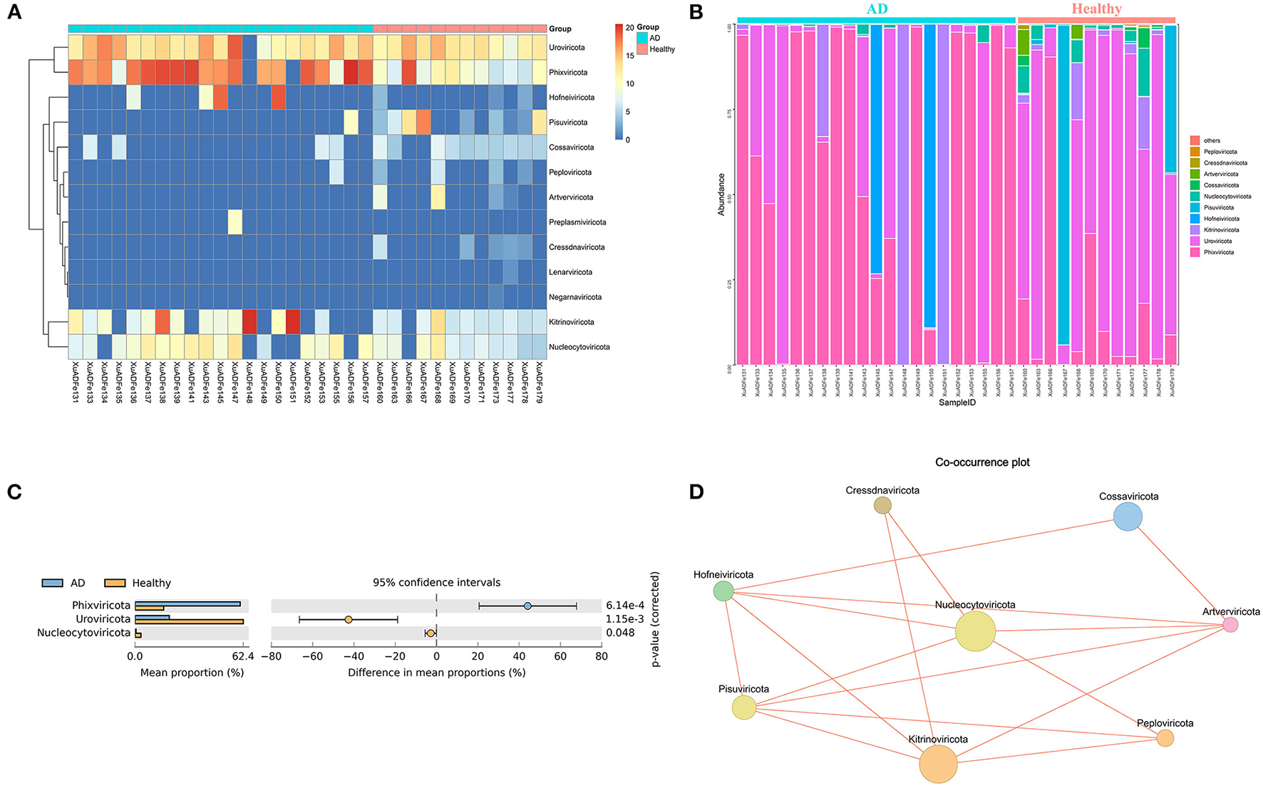 Analysis of differences in the composition of gut viral communities in AD patients and healthy controls group at the phylum level. (A) Clustering heatmap of representative virus families from 33 pools. The column name at the bottom of the figure indicates the pool number. The blue bar at the top of the figure represents the AD patients group, and the red bar represents the healthy controls group. The row name on the right side of the figure represents the name of the virus phylum. The number of reads is logarithmically converted with log10 as the base, and the legend is shown in the upper right corner. (B) Bar graph of viral community analysis of AD patients and healthy controls. (C) Analysis of differences between groups using STAMP. (D) Network analysis. Co-occurrence plot drawn with Megan6 software. Jaccard index was used to compare the similarity and difference between sample sets. The red line segment represents the anti-occurrence edge.