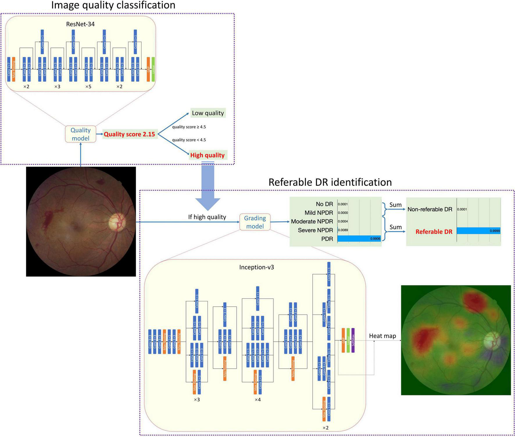 Before the inclusion of fundus images, evaluation of image quality was conducted through manual screening by ophthalmologists. Image quality assessment criteria were based on the following factors: (1) focus; (2) brightness; (3) the area of the image includes the entire optic disc and macula or not; and (4) there are defects in the image that affect the classification judgment or not (e.g., dust spots, deformation, eyelashes). Image quality was classified as “excellent,” which means all lesions can be graded, “good” if there are only 1–2 factors affecting image quality, “adequate quality” if there are 3–4 problems that affect image quality but all lesions grading is not affected, “insufficient for full interpretation” if one or more lesions cannot be graded, “insufficient for any interpretation” and “others” if some other quality factors interfered with grading.