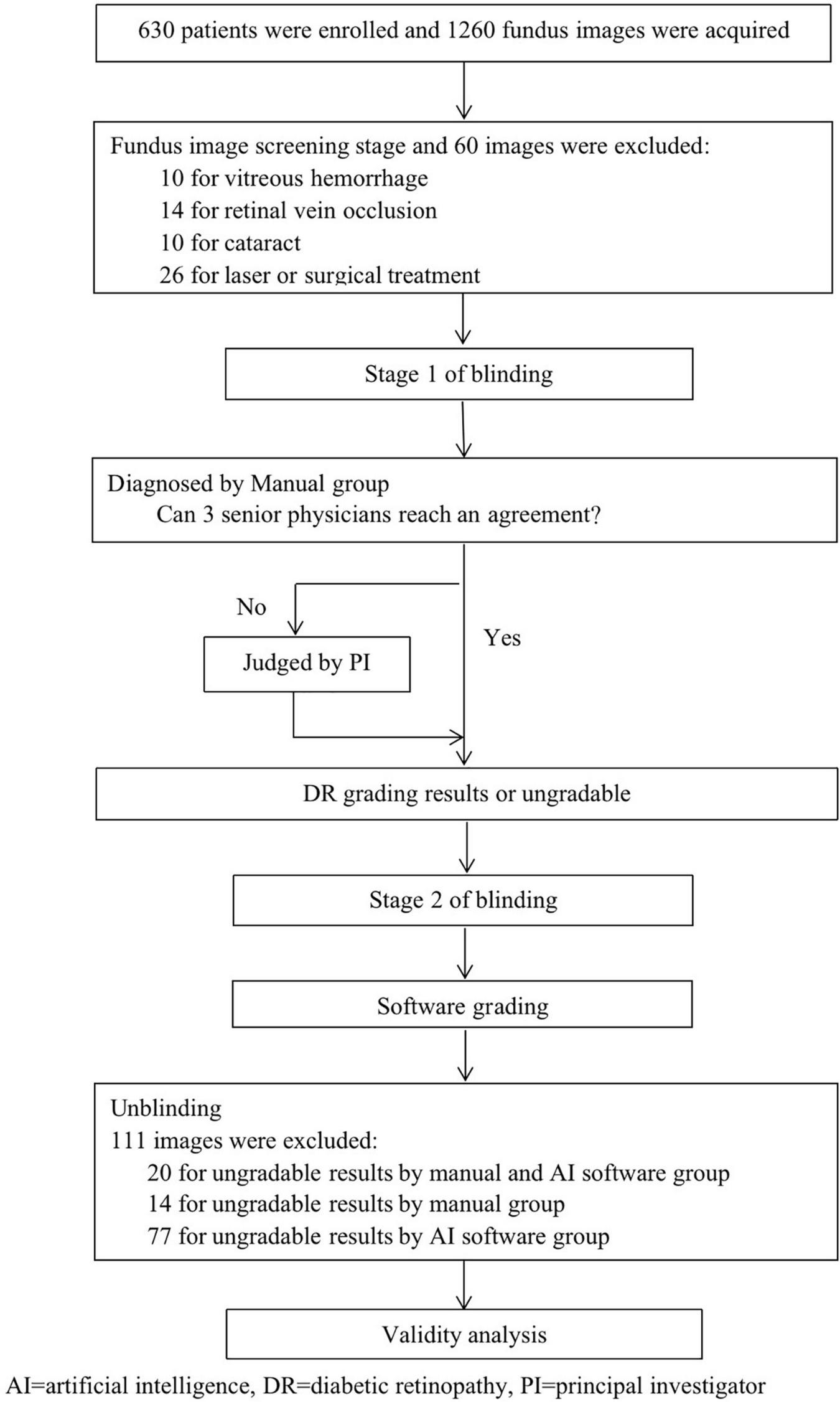 This prospective clinical trial was a multicenter (Peking Union Medical College Hospital, Eye Hospital China Academy of Chinese Medical Sciences, and Beijing Friendship Hospital of Capital Medical University), double-masked and self-control trial, aiming to evaluate the feasibility and safety of EyeWisdom V1 for the diagnosis of DR through the comparison with manual grading. All patients signed an informed consent form (ICF) approved by the Ethics Committee (EC) (or exempted from signing the ICF authorized by the Ethics Committee). This clinical trial met the ICMJE requirements and was registered in the Beijing food and drug administration of China (No.20180294).