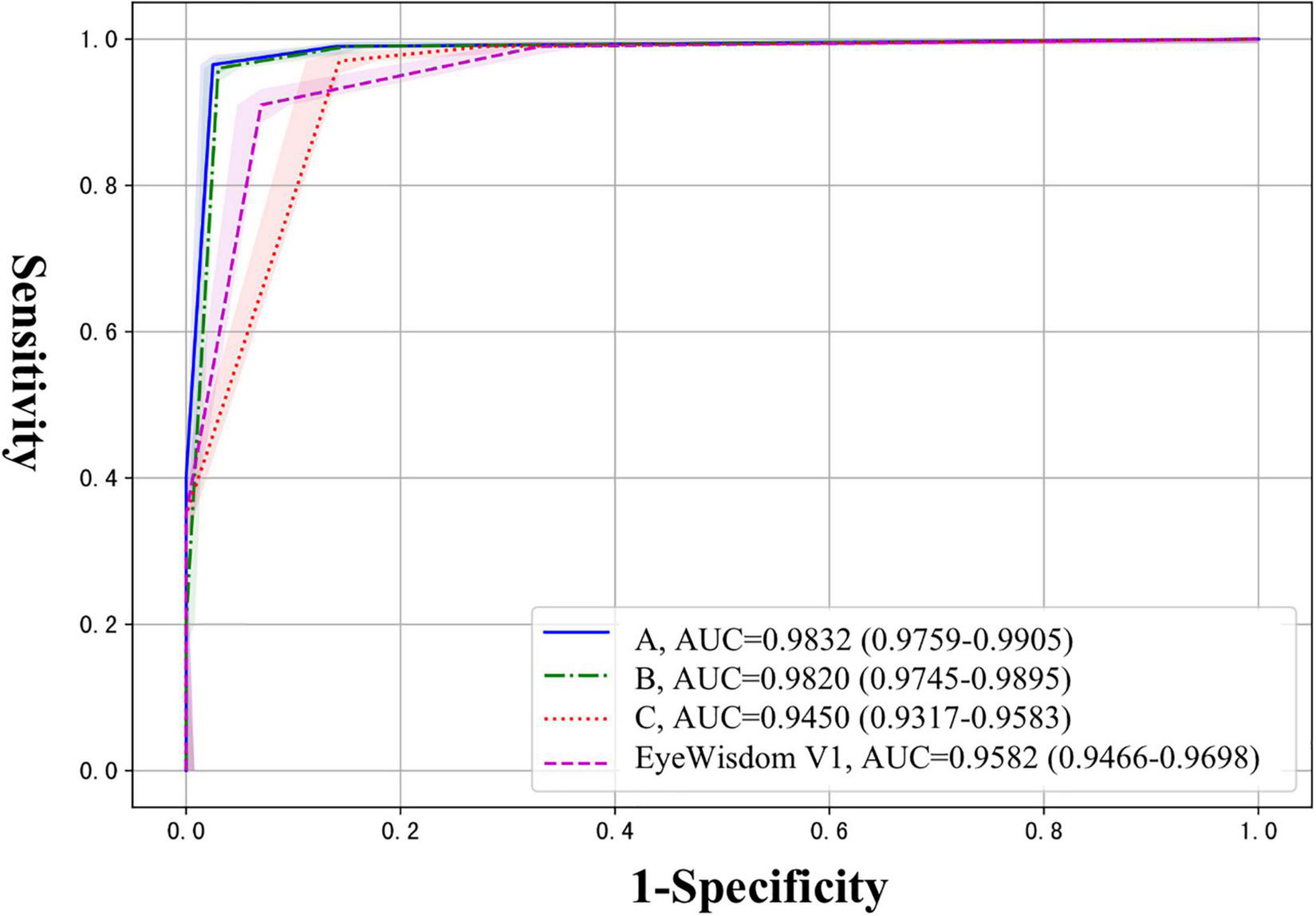 Primary evaluation index (sensitivity and specificity), as well as secondary evaluation index such as positive predictive values (PPV), negative predictive values (NPV), the quadratic weighted kappa score and the area under the receiver operating characteristic curve (AUC) were calculated to evaluate the performance of EyeWisdom V1.