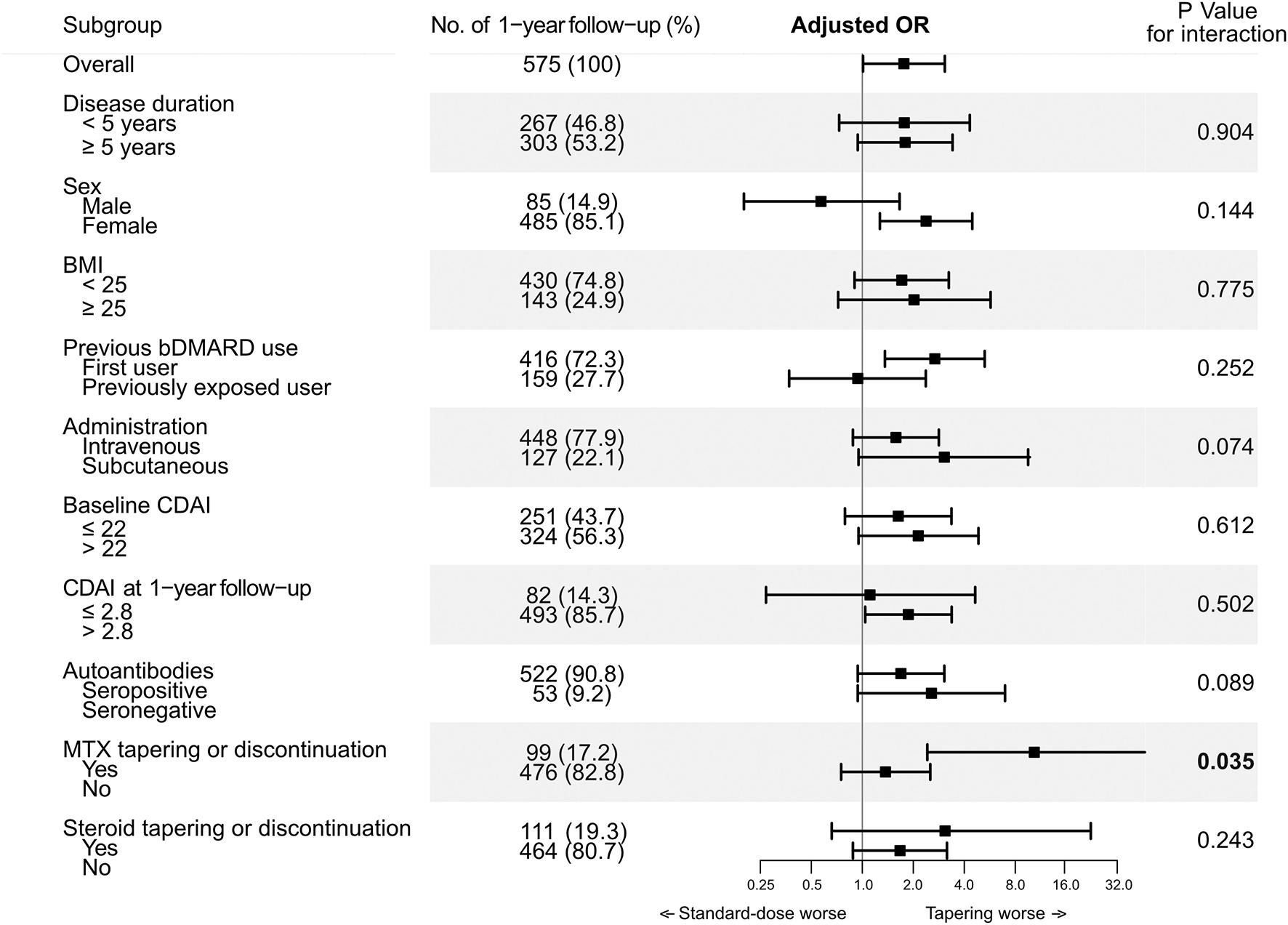 To further evaluate if the effect of tapering TCZ dose on loss of CDAI-LDA could differ according to the clinical features of the patients, the main analysis was stratified by sex, disease duration, BMI, bDMARD exposure, route of administration, baseline disease activity, autoantibody status, and concomitant tapering of MTX or glucocorticoids (Figure 2). In the subgroup of 1-year intervals in which concomitant MTX was tapered or discontinued (n = 99), tapering the dose of TCZ was significantly associated with loss of CDAI-LDA (adjusted OR 10.61 [2.42–46.59]). However, in the subgroup of 1-year intervals without MTX tapering or discontinuation, the association between TCZ tapering and the loss of CDAI-LDA was insignificant (adjusted OR 1.37 [0.75–2.52]).