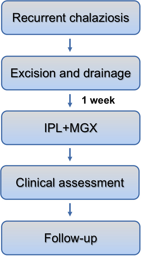 To date, the outcomes of the use of this technology for the management of chalaziosis recurrence have not been previously reported. The purpose of the present study was to investigate the efficacy of IPL-MGX in cases of recurrent chalaziosis after surgery.
