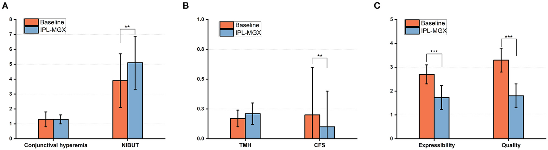 Changes in the bulbar conjunctival hyperemia, NIBUT (A), TMH, CFS score (B), and the expressibility and quality of meibum (C) between baseline and 4 weeks after the final IPL-MGX treatment session (**P < 0.01, ***P < 0.001).