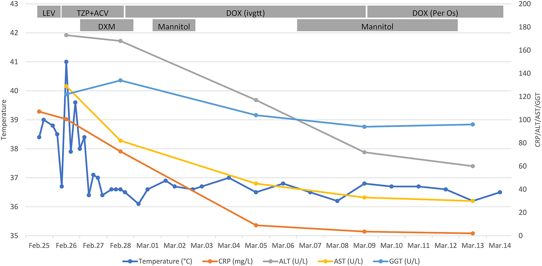 Clinical course of the 48-year-old patient. Timeline showed the dynamic monitoring of the patient's body temperature, and the level of CRP, ALT, AST, GGT. Besides, daily treatment schemes of the patient were recorded. CRP, C-reactive protein; ALT, alanine transaminase; AST, aspartate aminotransferase; GGT, gamma-glutamyltransferase; LEV, levofloxacin; TZP, piperacillin-tazobactam; ACV, acyclovir; DOX, doxycycline; DXM, dexamethasone; ivgtt, intravenously guttae.