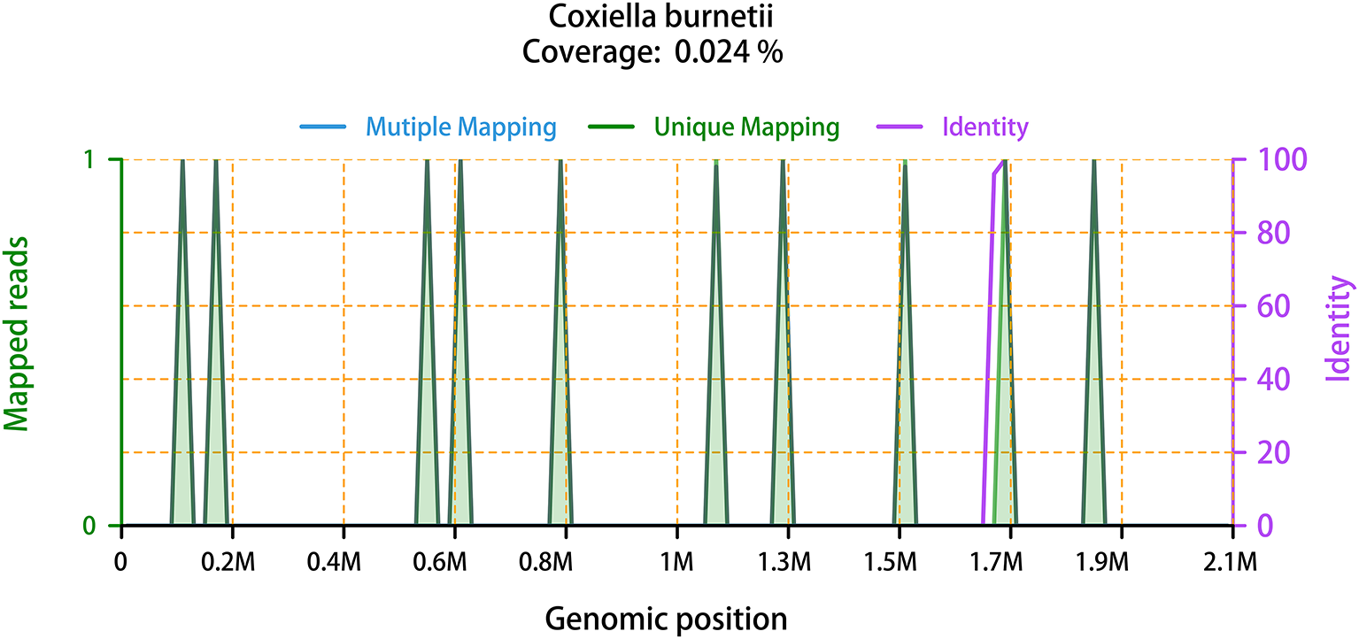 The mapped reads of C. burnetii, with the genome coverage of 0.024%. It showed the distribution of ten “Unique mapping” reads of C. burnetii identified by mNGS in the overall genome of C. burnetii. The ten reads covered 0.024% of C. burnetii genome. “Mutiple Mapping” indicates that the read can be mapped with the genome of C. burnetii, but not unique. “Unique Mapping” means that the read can be uniquely mapped to the genome of C. burnetii, but cannot be mapped to other species. Each read of “Unique Mapping” has its corresponding “Identity”. One purple line that represents “Identity” is at around 1.7 M genomic position. Another nine of the ten “Identity” curves are 100% overlapping with the green “Unique Mapping” curves, thus, they are not visible in this figure.