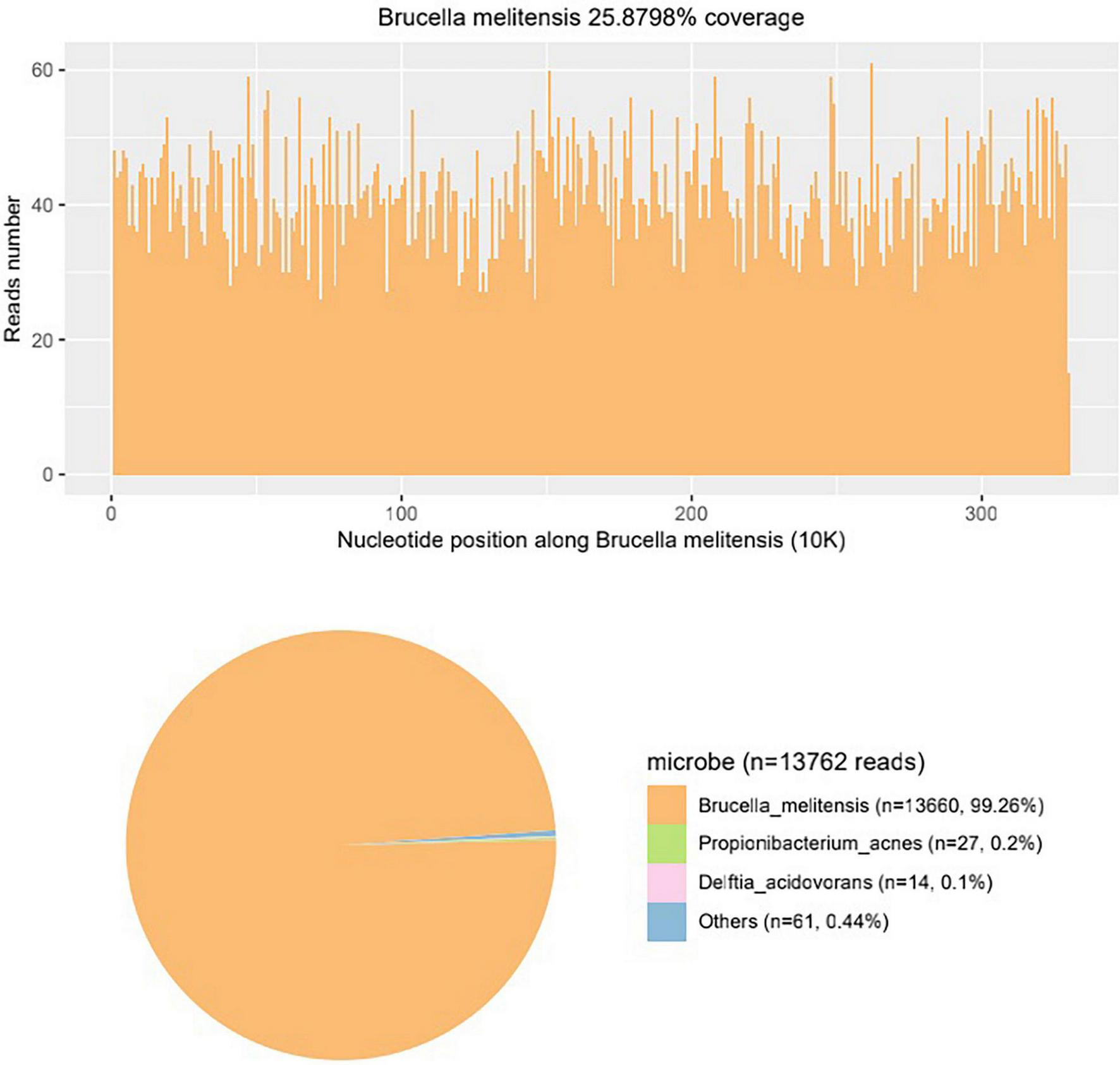 The mNGS result of the aqueous humor shows Brucella melitensis nucleotide reads account for the vast majority, identifying that the pathogen of the patient is Brucella melitensis.