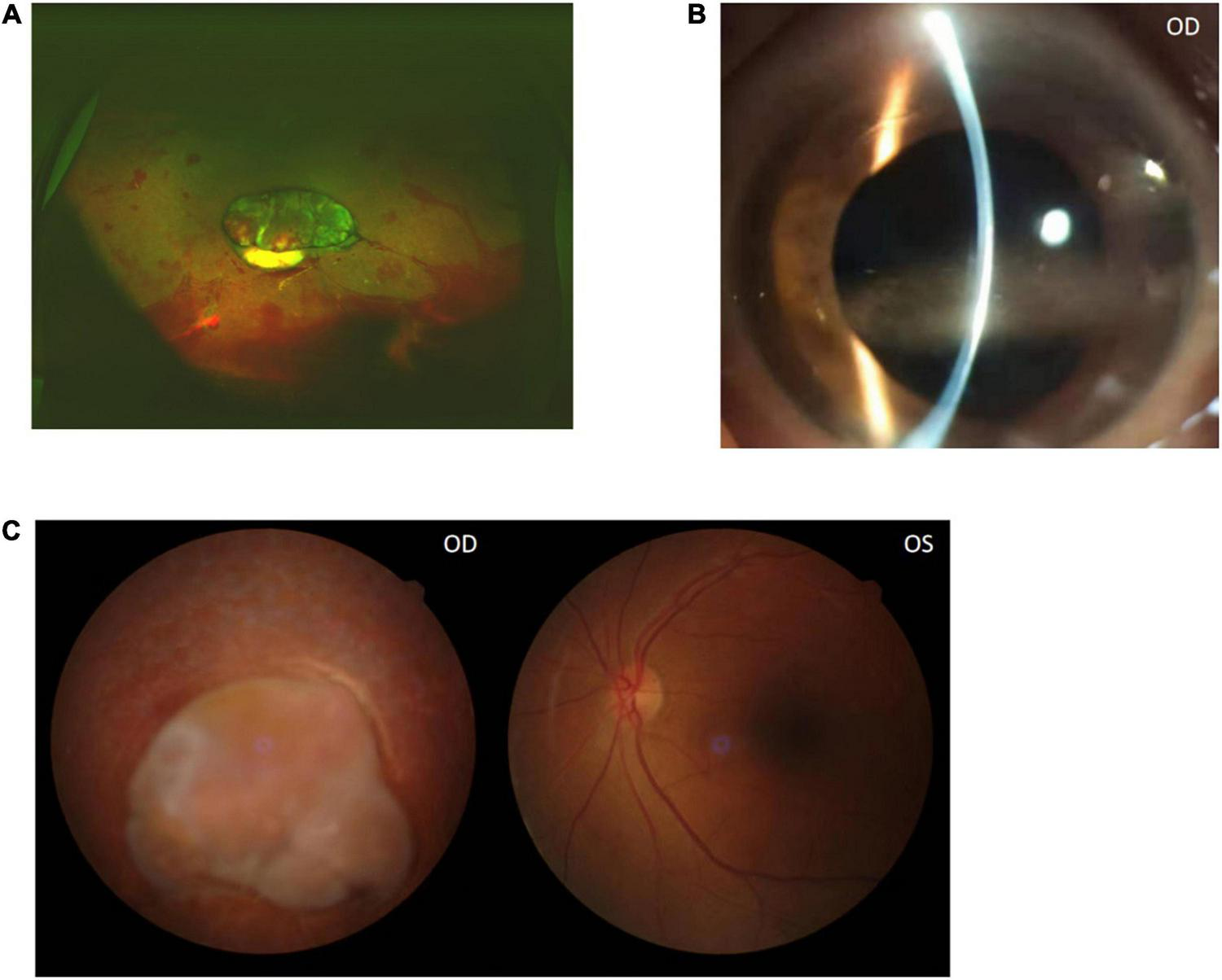 On 13 August 2020, a 57-year-old female was admitted to the hospital due to right-eye vision loss for 1.5 months. Previously, the patient had received treatment in a regional hospital on 21 June. She was diagnosed with a vitreous hemorrhage and was treated with oral medications. The patient developed a fever with red eyes and eyelid edema in the right eye 2 days later. Positive symptoms of the right eye including mixed conjunctival hyperemia, retrocorneal pigment KP, aqueous turbidity, and exudation in the pupil area, and these were recorded by the regional hospital. The structure of the posterior segment of the eye is unclear. The local ophthalmologist diagnosed panuveitis of the right eye and applied mydriatic drugs, anti-inflammatory dexamethasone eye drops, and intravenous infusion of clindamycin and dexamethasone sodium phosphate 10 mg. After these treatments, the patient felt the symptoms lessened, and the systemic dexamethasone sodium phosphate was thus gradually reduced to 5 mg. However, the eye symptoms were then aggravated. The patient was transferred to a tertiary hospital afterward. Her initial visual acuity was Hand Motion OD and 20/30 OS. Slit-lamp examination revealed slight hyperemia of the conjunctiva, transparent cornea, deep anterior chamber, turbid aqueous humor, less round pupil, posterior iris adhesion, opaque lens, and obvious vitreous opacity with invisible fundus of the right eye (Figure 1). There was no ocular pathology of the left eye. The patient was diagnosed with infectious endophthalmitis and admitted to the current hospital (Figure 2).