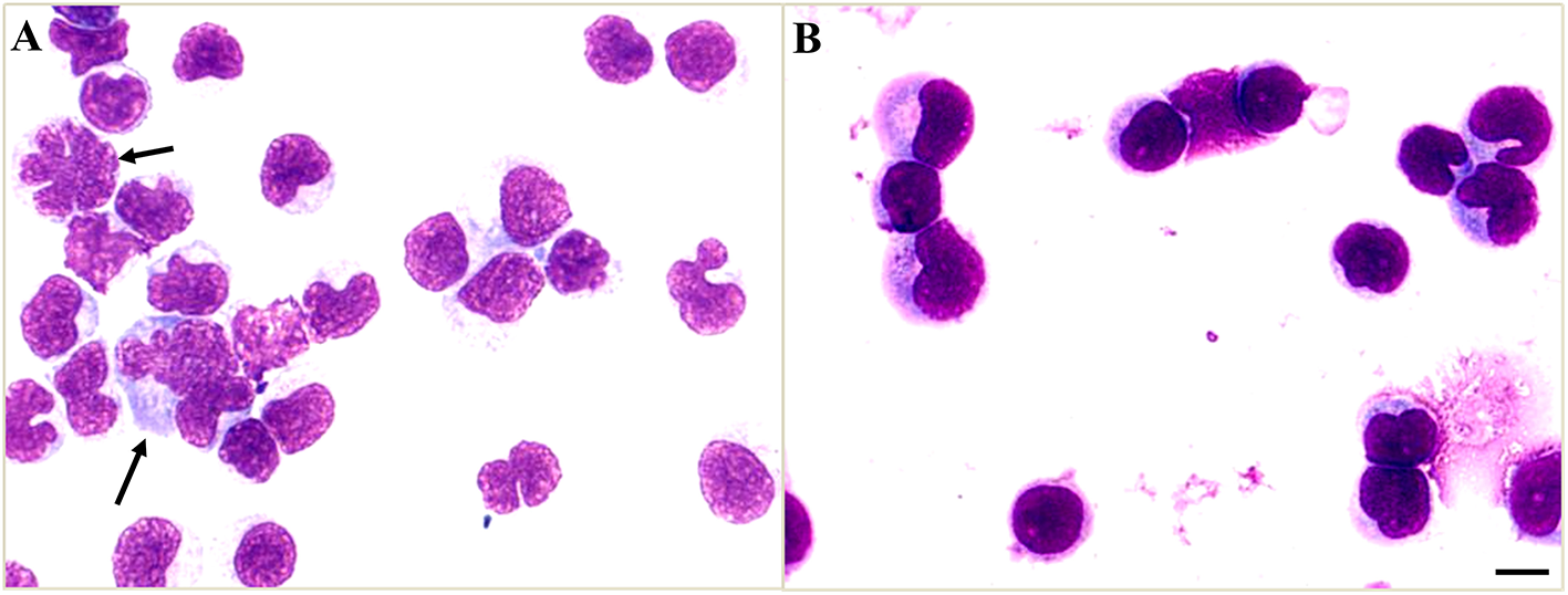 Cerebrospinal fluid (CSF) cytology shows atypical cells. (A) The atypical cells of CSF on day 5 after admission were scattered and varied in size, the cell membrane was malformed, and had a high nuclear-cytoplasmic ratio (black arrows). (B) The CSF cytology on day 19 after admission showed reactive lymphocytes and monocytes. Scale bars: 100 μm.