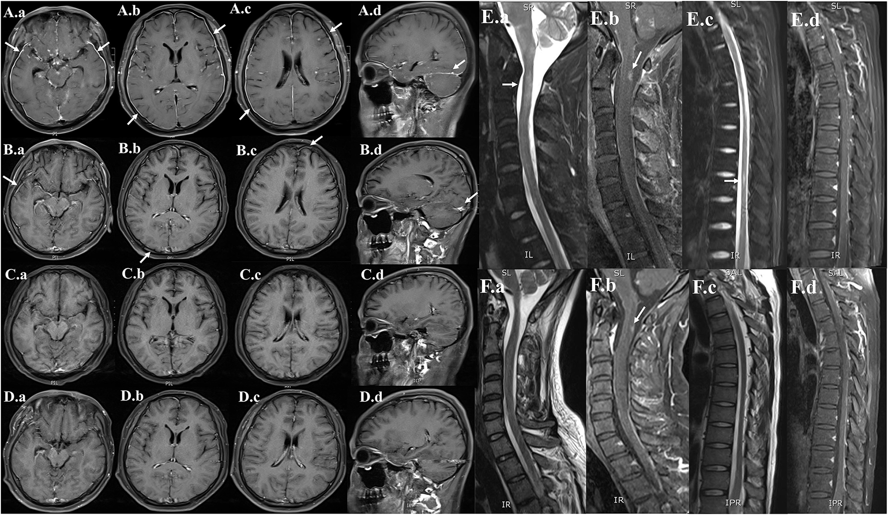 Serial neuroimaging with MRI demonstrating lesion amelioration. (A) Contrast-enhanced MRI brain (hospital day 5), (a,b,c) axial and (d) sagittal T1-weighted images showing diffuse leptomeningeal and pachymeningeal contrast enhancement (white arrows). (B) Repeat MRI on hospital day 29, (a,b,c) axial and (d) sagittal views showing less meningeal enhancement after 3 weeks of therapy. (C) Repeat MRI on the time of discharge (hospital day 62), (a,b,c) axial and (d) sagittal views showing the obvious resolution of the previous meningeal enhancement. (D) Repeat MRI on 6-month follow-up (a,b,c) axial and (d) sagittal views showing no meningeal enhancements. (E) MRI of the cervical and thoracic spine (hospital day 5), (a,c) sagittal T2-weighted and (b,d) post-contrast T1-weighted showing abnormal longitudinally extensive T2 weighted hyperintensities involving the C2–C3 and T6–T9. Partial enhancement was observed in the dorsal aspect of the spinal cord at C2 and T6–T7 levels (white arrows). (F) Repeat MRI on hospital day 29, (a,c) sagittal T2-weighted and (b,d) post-contrast T1-weighted images showing lesser abnormal hyperintensities compared with previously.