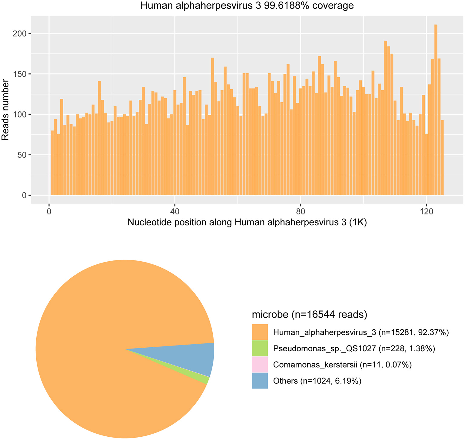 The metagenomic next-generation sequencing (mNGS) results of pathogen identification. Approximately 92.37% of viral reads corresponded to Human alphaherpesvirus 3 (also named the Varicella-zoster virus) with coverage of 99.6188% in CSF.