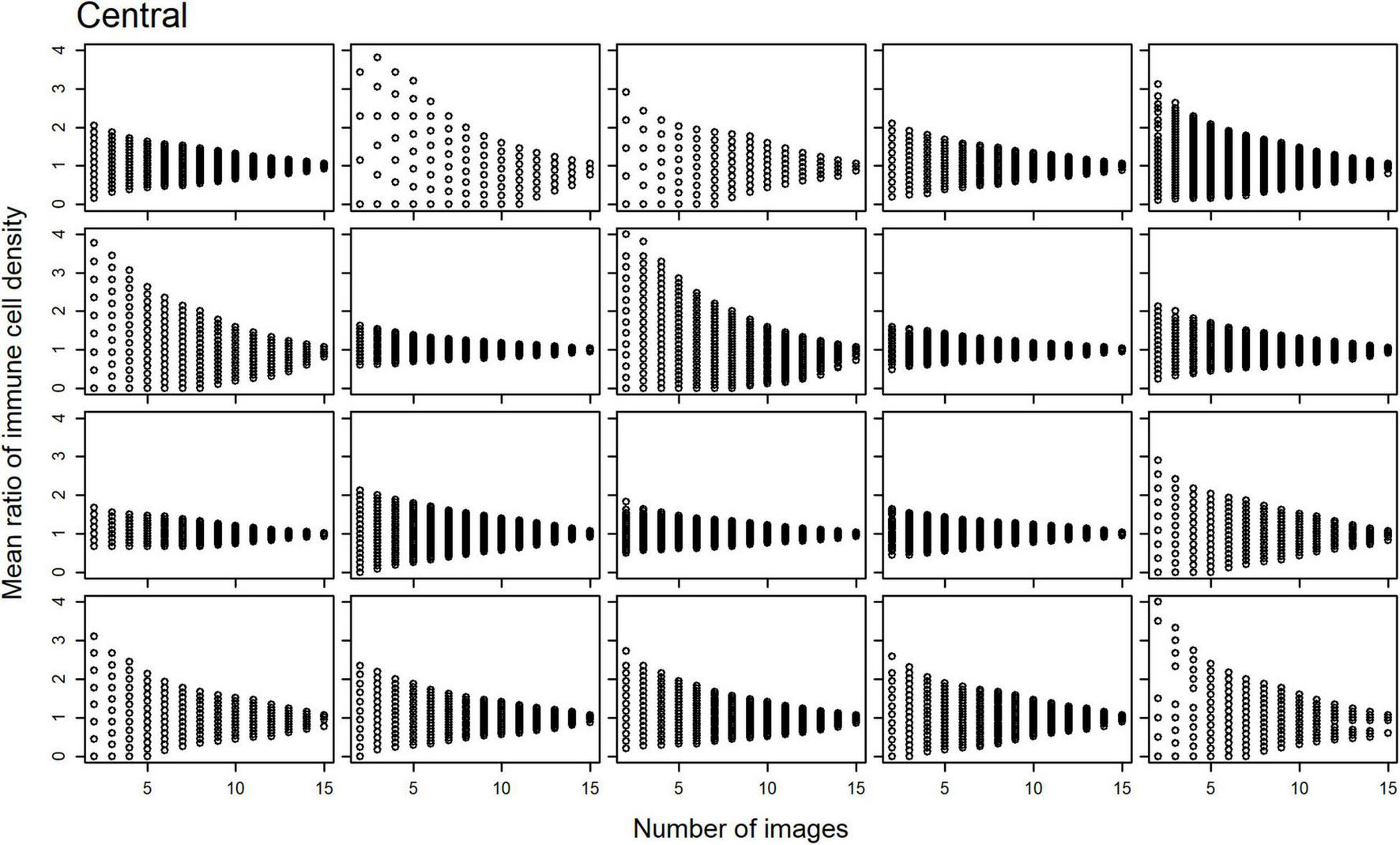 Scatterplots of the mean ratio for corneal epithelial immune cell (IC) density relative to the number of randomly selected, non-overlapping IVCM images used for the density estimate for each participant, in the central cornea.