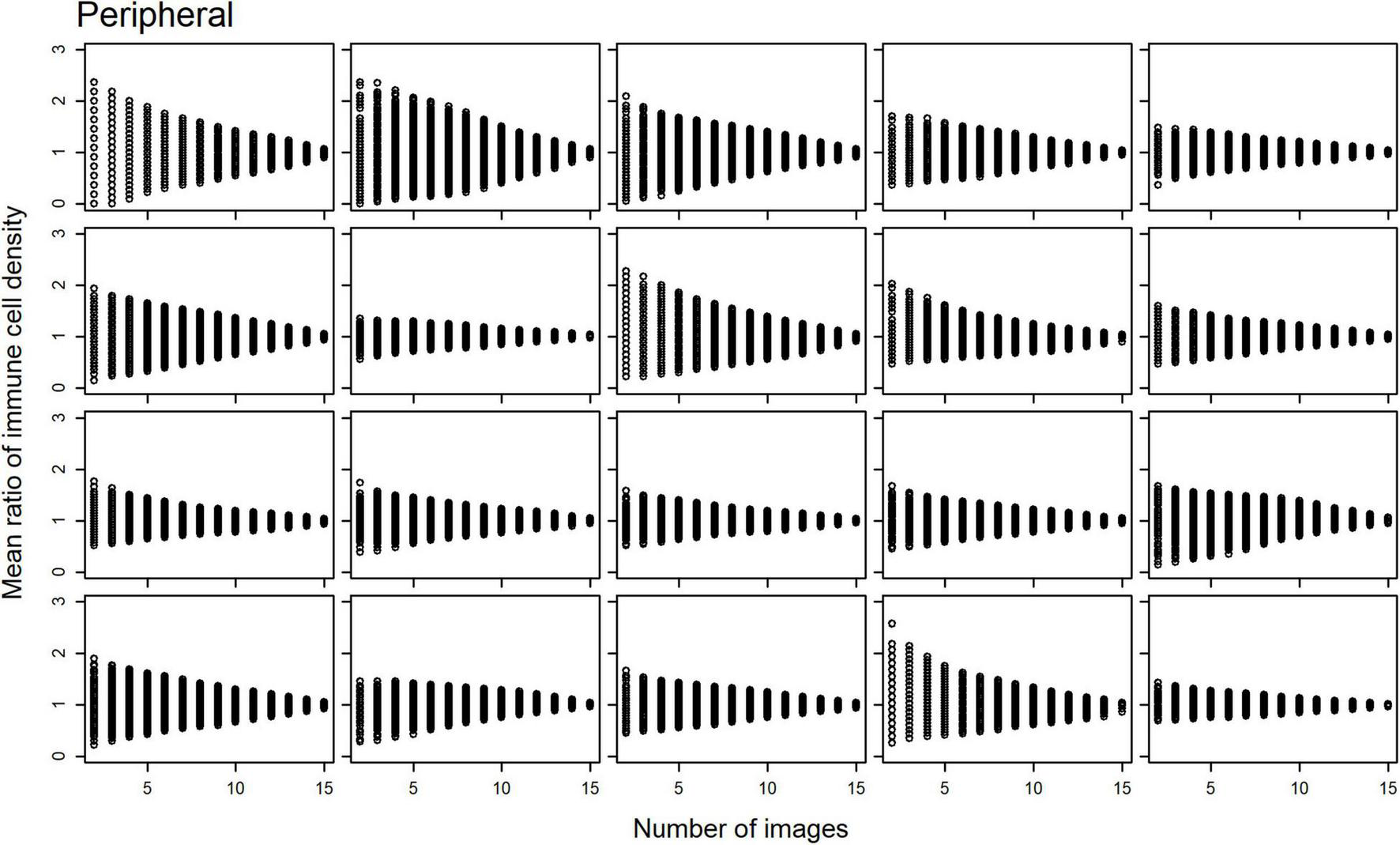Scatterplots of the mean ratio for corneal epithelial immune cell (IC) density relative to the number of randomly selected, non-overlapping IVCM images used for the density estimate for each participant, in the peripheral cornea.