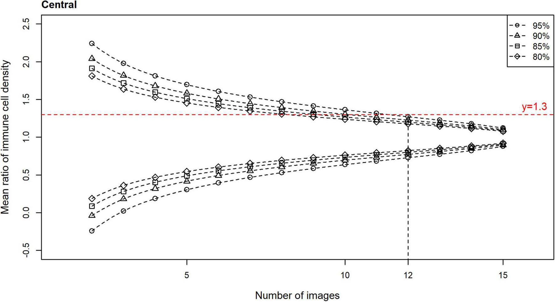 Confidence intervals (CIs) with 80, 85, 90, and 95% levels of confidence for the mean ratio for corneal epithelial immune cell (IC) density relative to the number of randomly selected, non-overlapping images used for the density estimate, for all participants for the central cornea. Horizontal line (mean ratio = 1.3) indicates the location where the estimated mean is 30% different from the true mean in the distributions. Vertical line (number of images = 12) indicates the number of images that is predicted to produce estimated means that are 30% different from the true mean (i.e., mean ratio = 1.3 or 0.7), at a confidence level of 95%, for the central cornea.