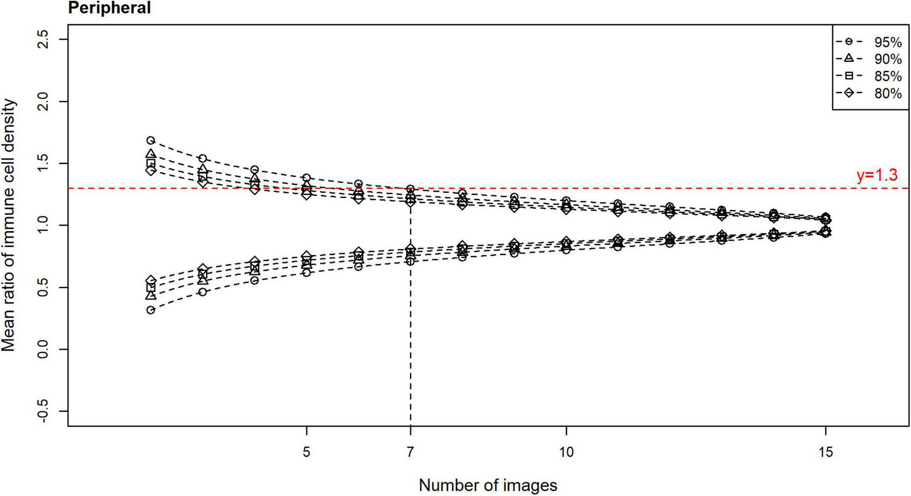 Confidence intervals (CIs) with 80, 85, 90, and 95% levels of confidence for the mean ratio for corneal epithelial immune cell (IC) density relative to the number of randomly selected, non-overlapping images used for IC density estimate, for all participants for the peripheral cornea. Horizontal line (mean ratio = 1.3) indicates the location where the estimated mean is 30% different from the true mean in the distributions. Vertical line (number of images = 7) indicates the number of images that is predicted to produce estimated means that are 30% different from the true mean (i.e., mean ratio = 1.3 or 0.7), at a confidence level of 95%, for the peripheral cornea.