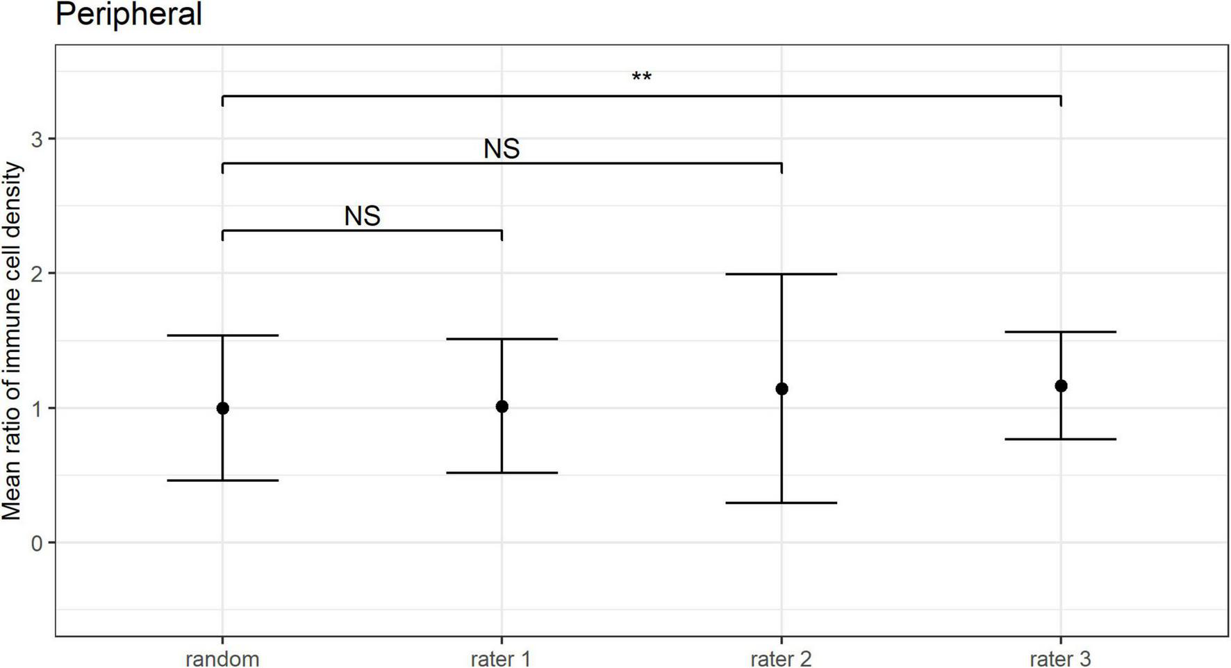 Peripheral corneal epithelial immune cell (IC) density mean ratios, and corresponding 95% CIs, obtained when IC density estimates derived from all combinations of three randomly sampled images (random), and when the “three representative images” were independently selected by three observers (i.e., raters 1 to 3). Mean ratios of IC density estimates derived from images selected by rater 3 were significantly higher in comparison to 3 randomly selected images (**p < 0.01; NS: p > 0.05).
