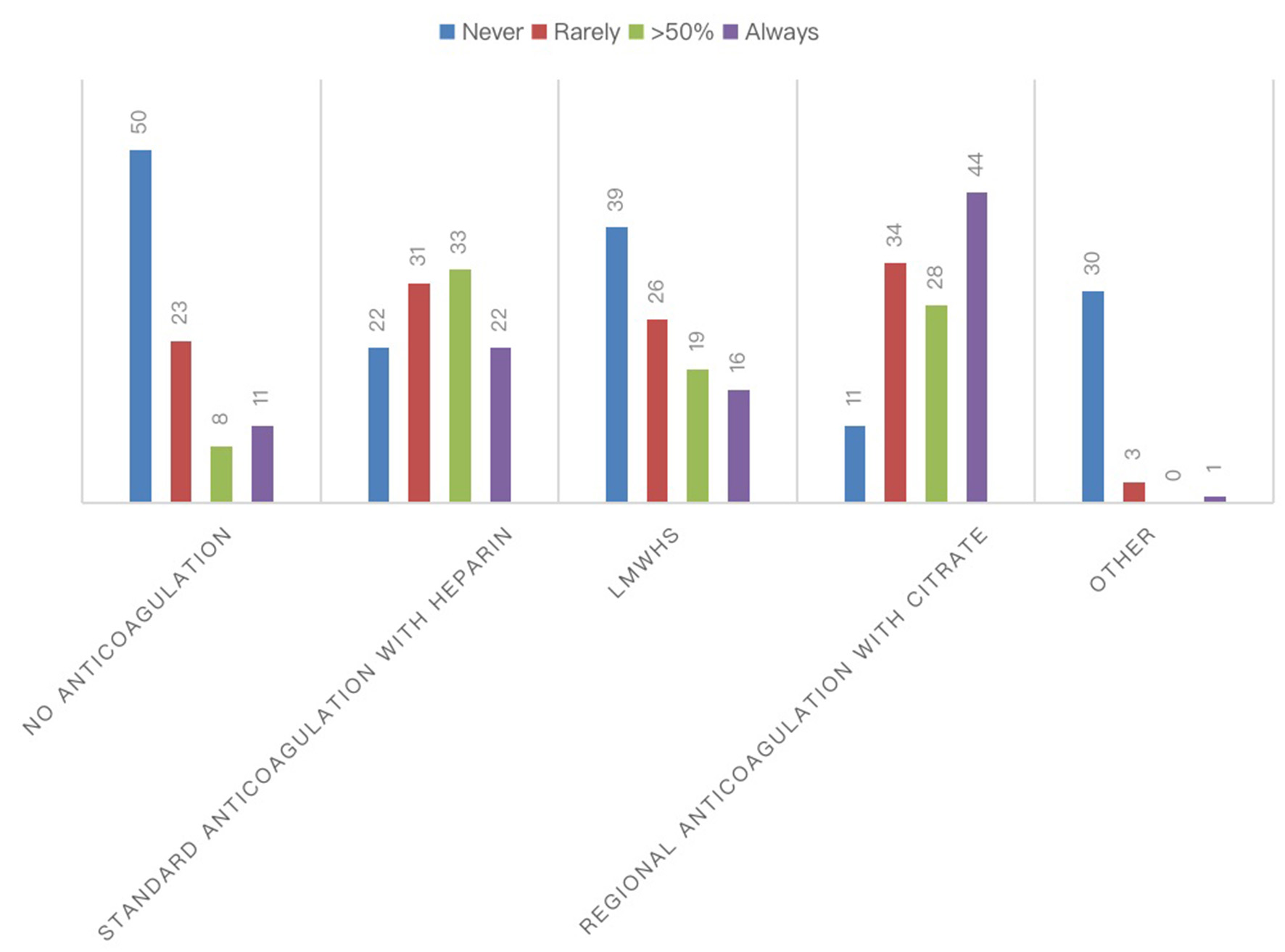 Anticoagulation strategies for RRTs during COVID-19 pandemic. The chart showed the absolute number of different anticoagulation strategies for the extracorporeal circuit in patients with COVID-19.