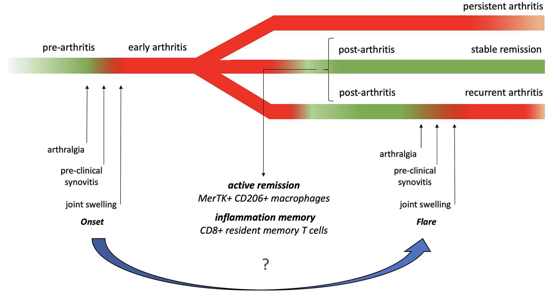 Focusing directly on the process of flare, Kuettel et al. explored the longitudinal associations between patient-reported flares and inflammatory dynamics on MRI. Pointing to an “outside-in” hypothesis, sequential analysis of inflammatory imaging changes in the hands showed a differential lesion pattern: synovitis and tenosynovitis increased early at flare onset, while bone marrow oedema evolved with delay and remained present for months (32). Two independent fascinating studies have recently pioneered in this specific RA phase through immune-pathologic analysis. Based on a longitudinal follow-up of patients with RA with sequential evaluations together with single-cell RNA sequencing of blood cells, Orange et al. (26) could identify a population of mesenchymal cells (PRIME, preinflammatory mesenchymal cells) exhibiting an increase in circulation just before flares of RA, but decreasing just after the appearance of symptoms. The expression analysis of PRIME cells identified a profile similar to that of synovial inflammatory sublining fibroblasts, suggesting a model involving the active migration of these cells into the flaring joint and their causative contribution to local inflammatory events. Chang et al. through the analysis of three different animal models of arthritis, have shown the possible long-term persistence of synovial resident memory T cells (Trm) in arthritic joints during remission. The same authors could also demonstrate the central role of CD8+ Trm in the maintenance of joint-specific memory in quiescent joints and in the mechanism of recurrent joint-specific flares (50). Whilst these data provide a potential immune-biologic explanation of the known trend of arthritis flare to recur preferentially in previously involved districts in human disease (51, 52), the mechanistic link between Trm activation in the joint and local homing of circulating PRIME cells remains to be clarified.