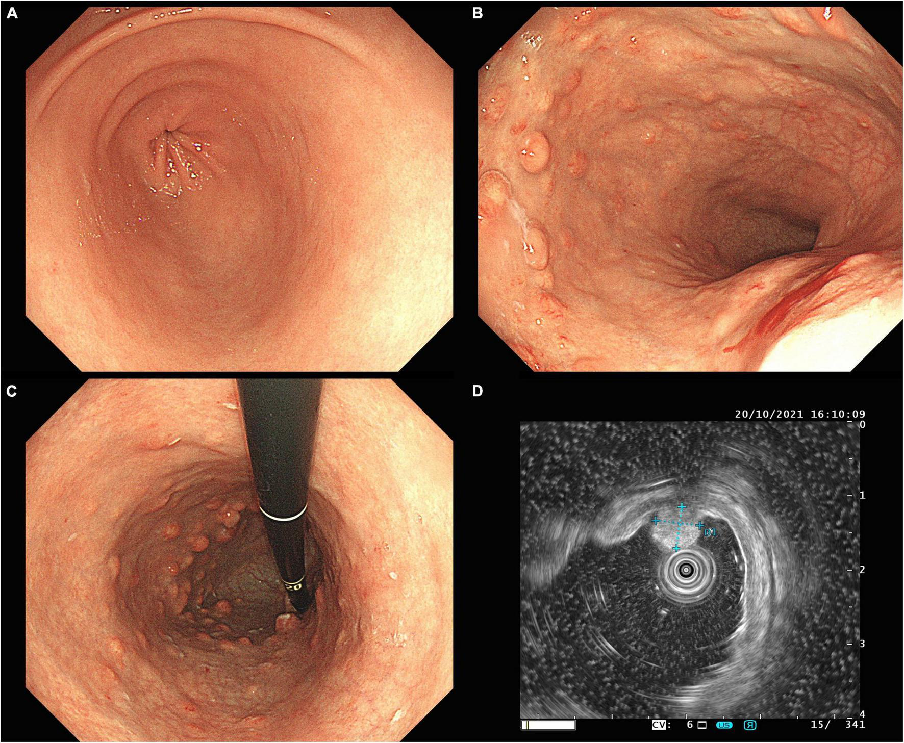 Routine gastroscopy revealed smooth mucosa in the gastric antrum (A), absence of gastric fold along the greater curvature of the gastric body (B), pale appearance of mucosa, increased visibility of vasculature, and multiple gastric submucosal bulges within gastric body, and fundus (B,C), EUS confirmed hyperechoic NETs originated from the muscularis mucosa, with an intact muscularis propria (D).