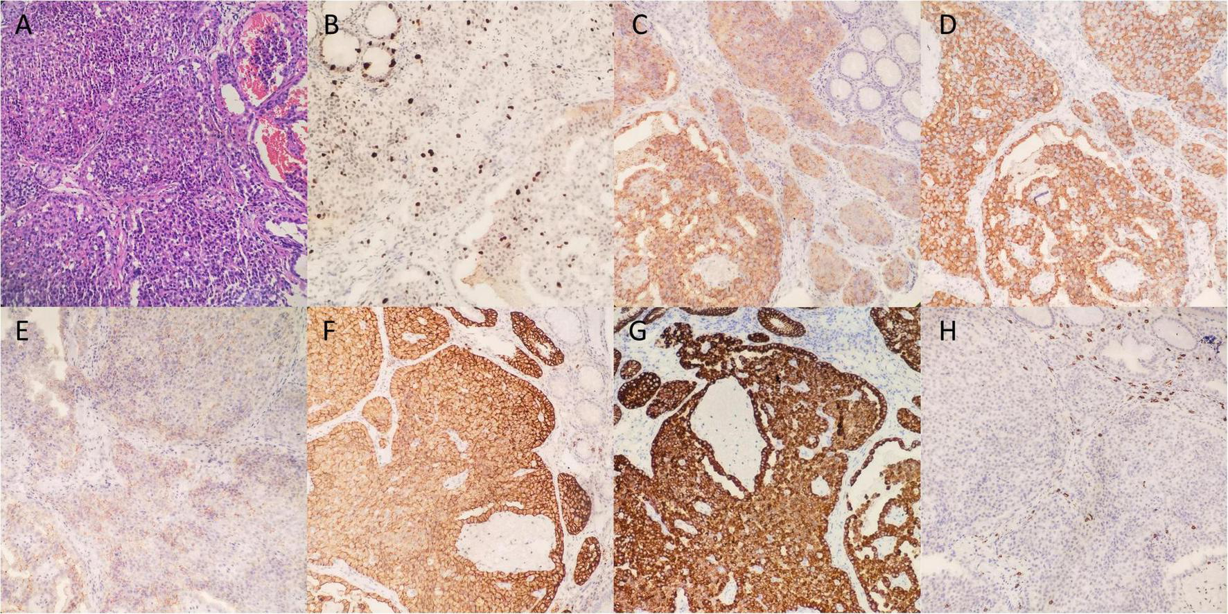 Histological findings of pathological biopsies. (A) Hematoxylin and eosin staining (200x). (B) Ki-67 staining revealed the Ki-67 index was 15% and mitotic rate was 12. The carcinoid showed positive staining of CgA (C), Syn (D), CD56 (E), SSTR2 (F), CK (G), and negative staining for CD117 (H).