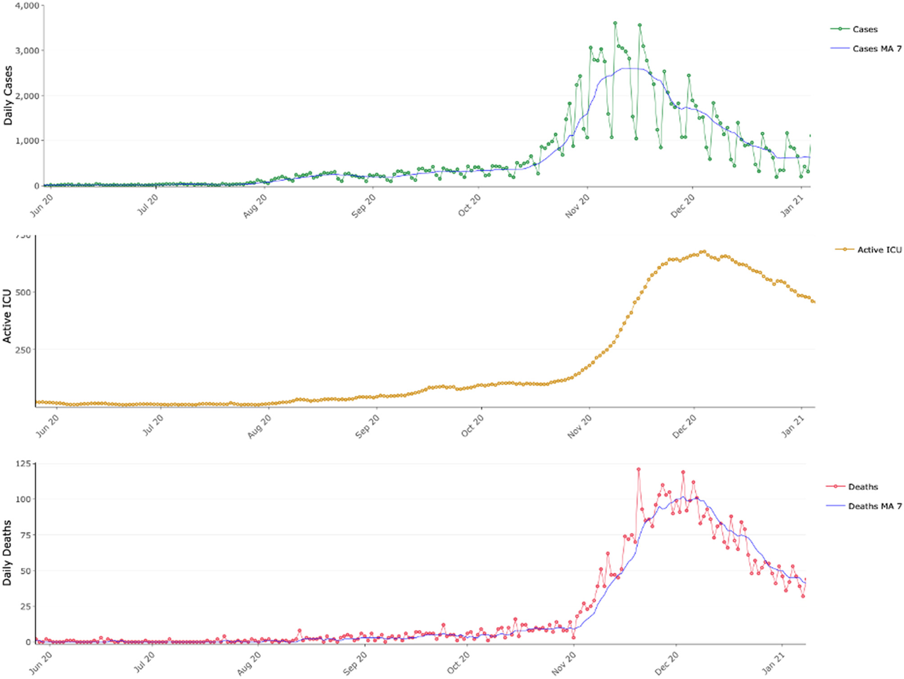 COVID-19 epidemic dynamics in Greece between June 2020 and January 2021. Daily reported COVID-19 cases with their 7-day moving average (MA 7), active COVID-19 intensive care unit beds and daily reported COVID-19 deaths along their 7-day moving average (MA 7).