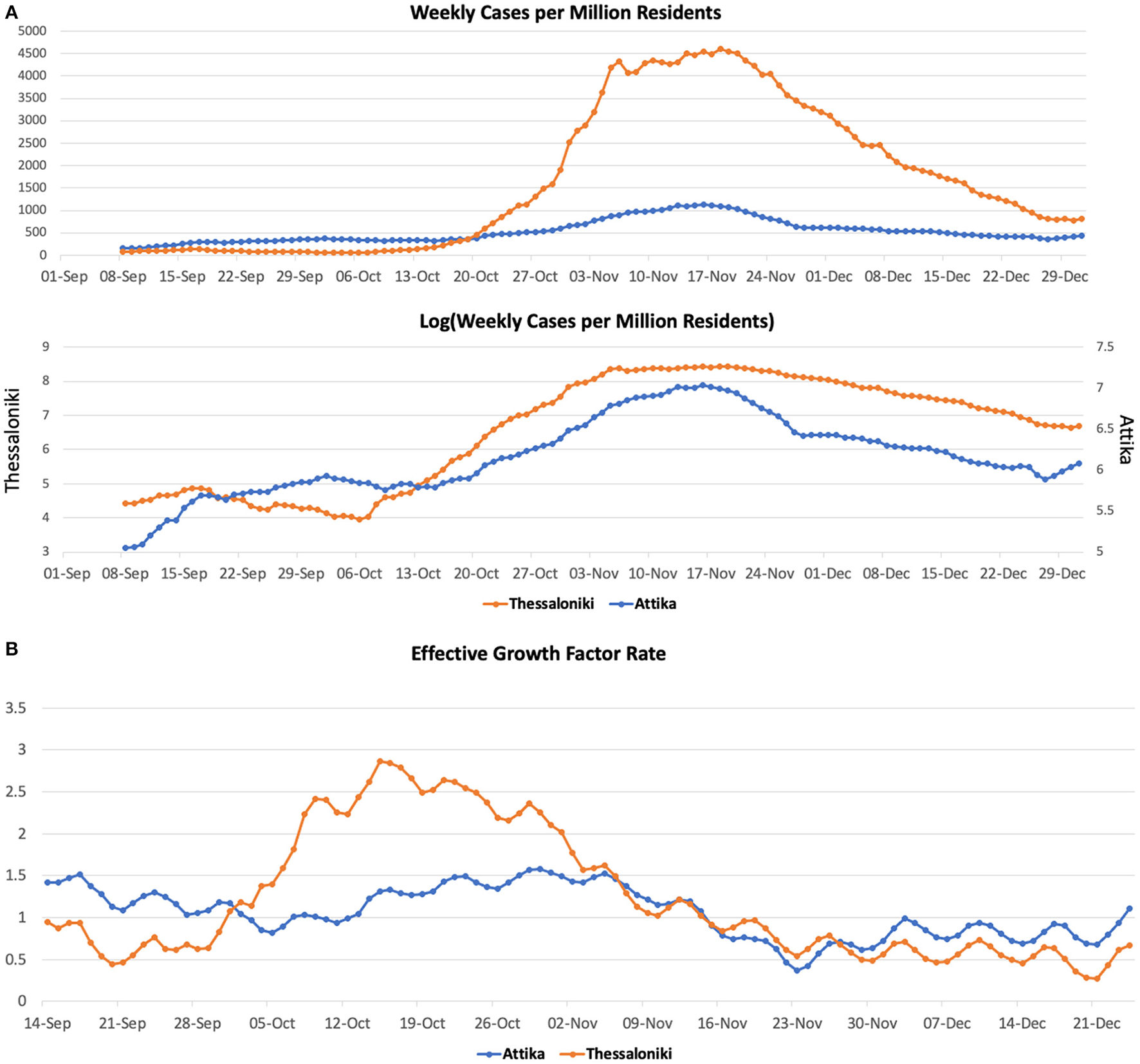 COVID-19 cases (A) and effective growth factor (B) in Attika and Thessaloniki between June 2020 and January 2021.