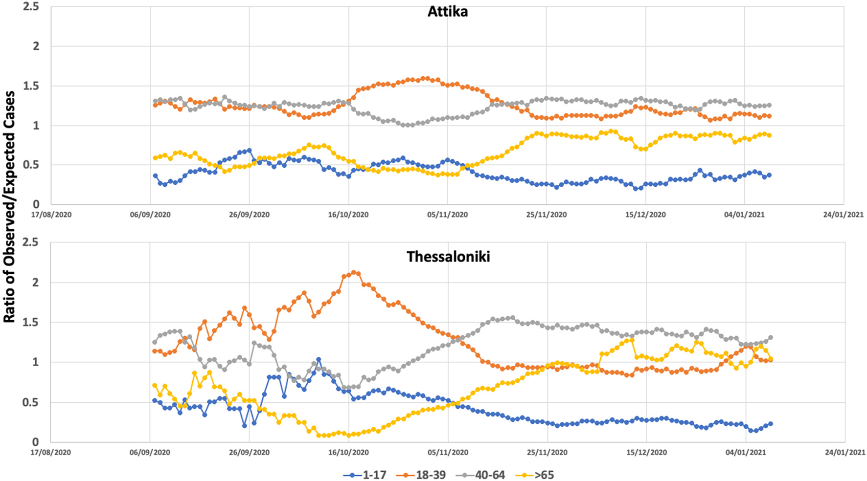 Ratio of observed versus expected number of COVID-19 cases within the age groups of 0–17, 18–39, 40–65, and >65 in Attika and Thessaloniki between September 2020 and January 2021.