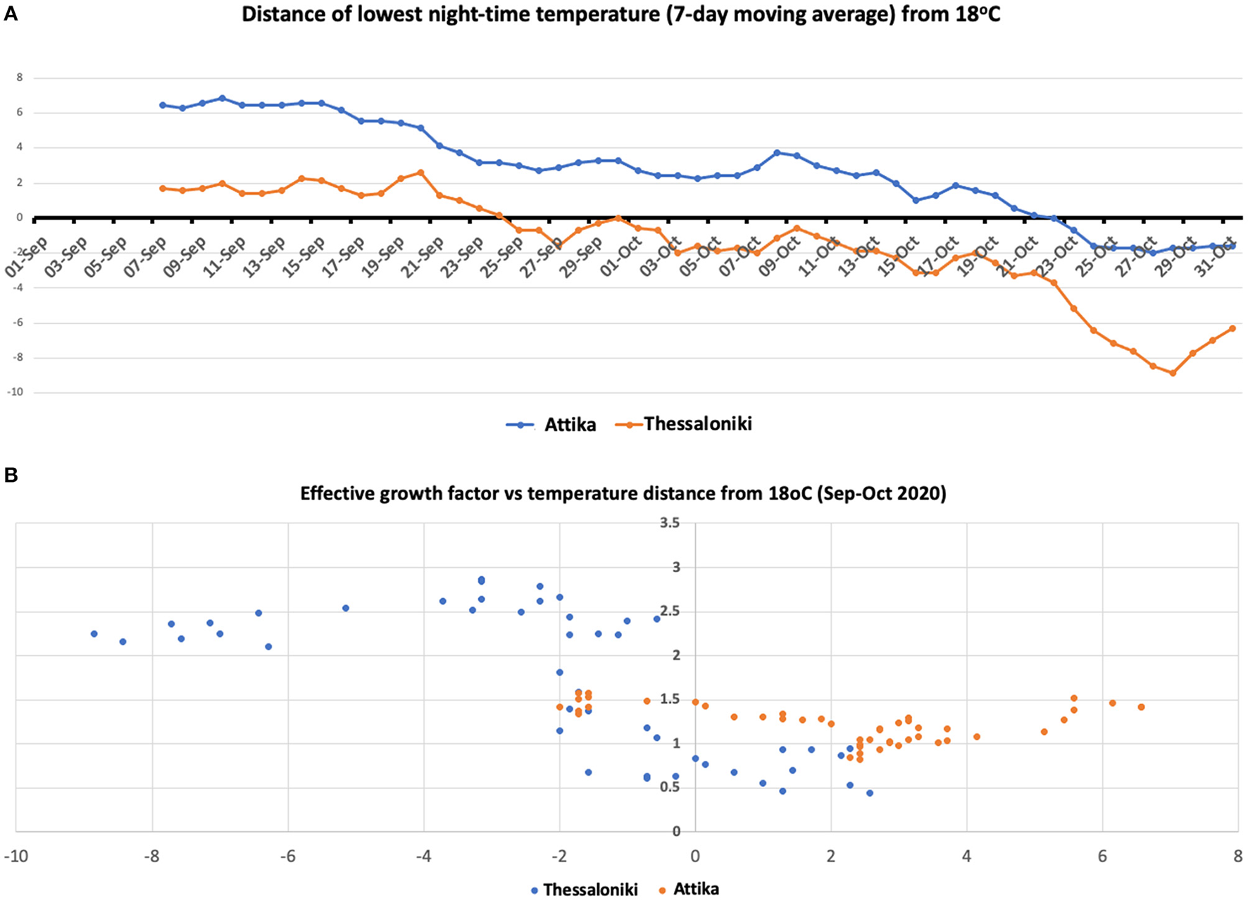(A) Seven-day moving average temperature difference from 18°C in Attika and Thessaloniki. (B) Scatterplot of the effective growth factor and moving average temperature difference from 18°C in Attika and Thessaloniki.