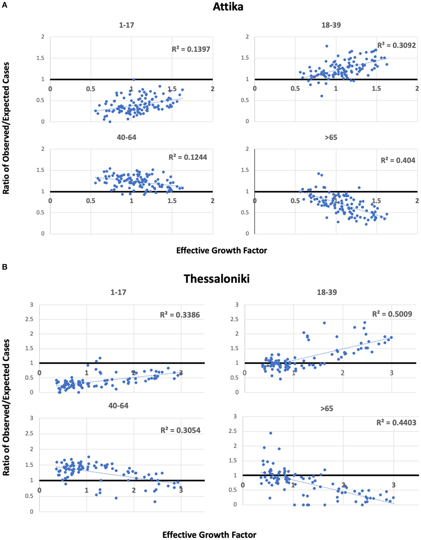 Scatterplots of observed/expected cases per age group and the effective growth factor in Attika (A) and Thessaloniki (B) along linear regression lines and estimated Pearson's R2.